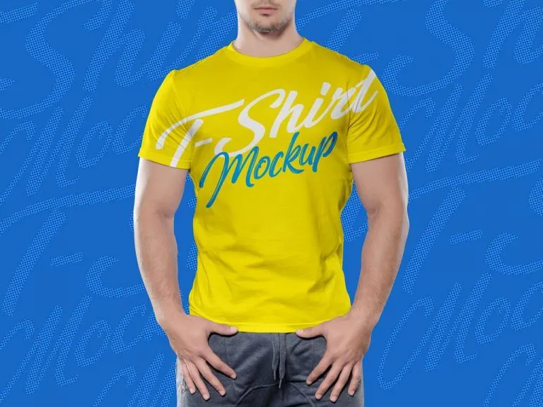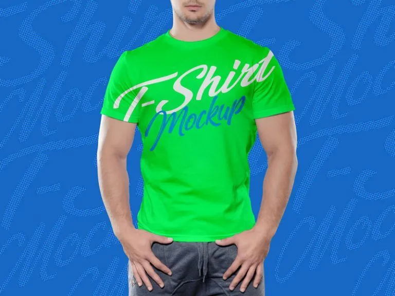 This T-shirt mockup features an athletic model standing with his hands resting casually on his legs. The front view clearly displays the entire front of the half-sleeve T-shirt, making it ideal for showcasing your latest apparel designs.