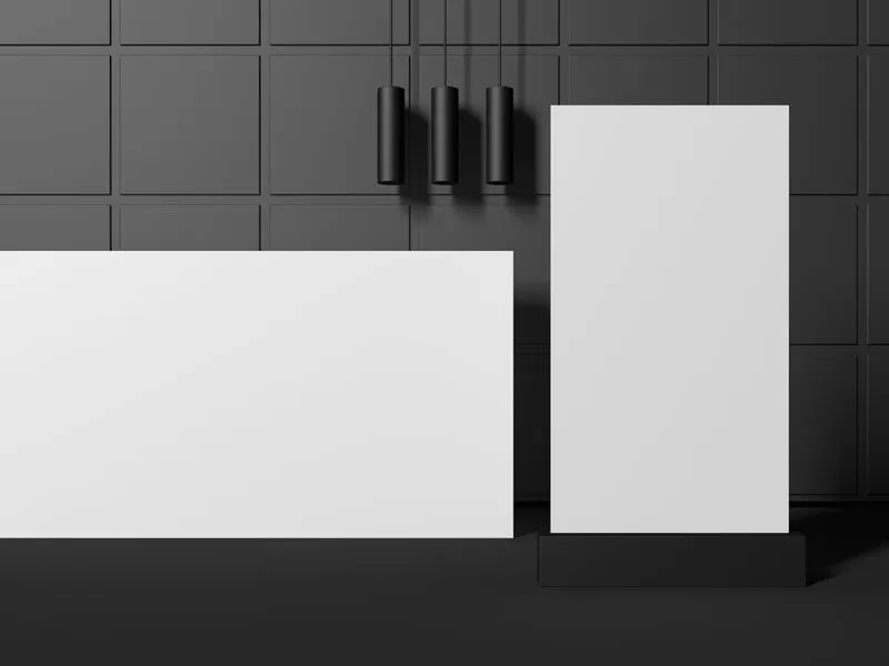 Have some interior office banner designs to promote? No big deal! Download this elegant and let it roll. It features 2 banners side by side, one vertical and one horizontal, so that you can simply examine your graphics in one frame.
