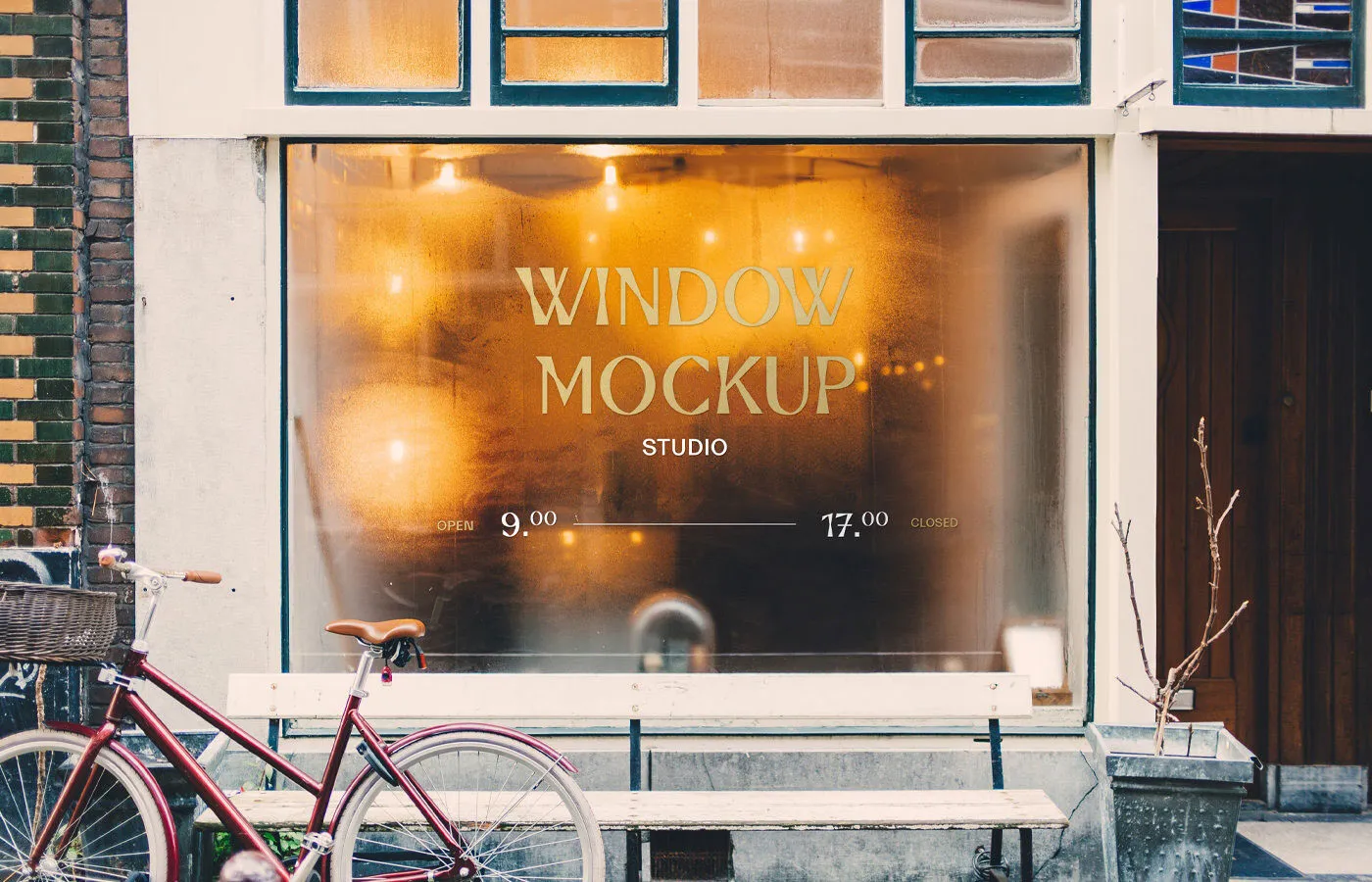 Front View Steamed Window Mockup with a Bicycle