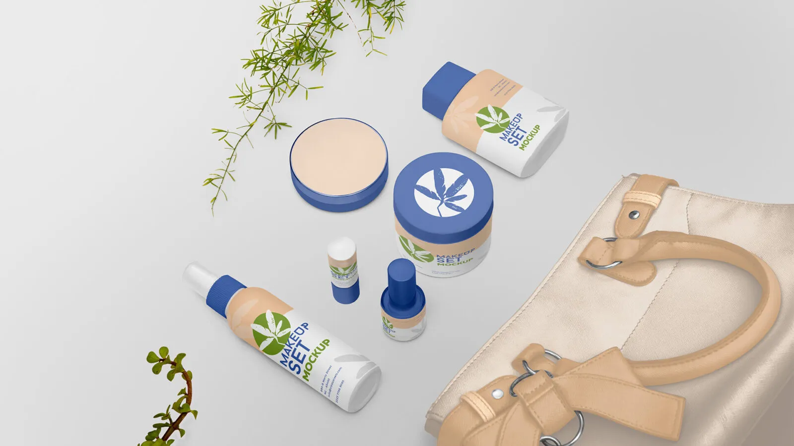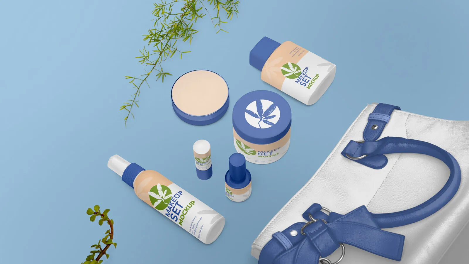 With smart-object put your design on the cream container, perfume, nail paint, lipstick, spray bottle, and jar. Then adjust background, colors, shadows, and light effects to suit your design. Why would you choose another way when you have found the perfect one?