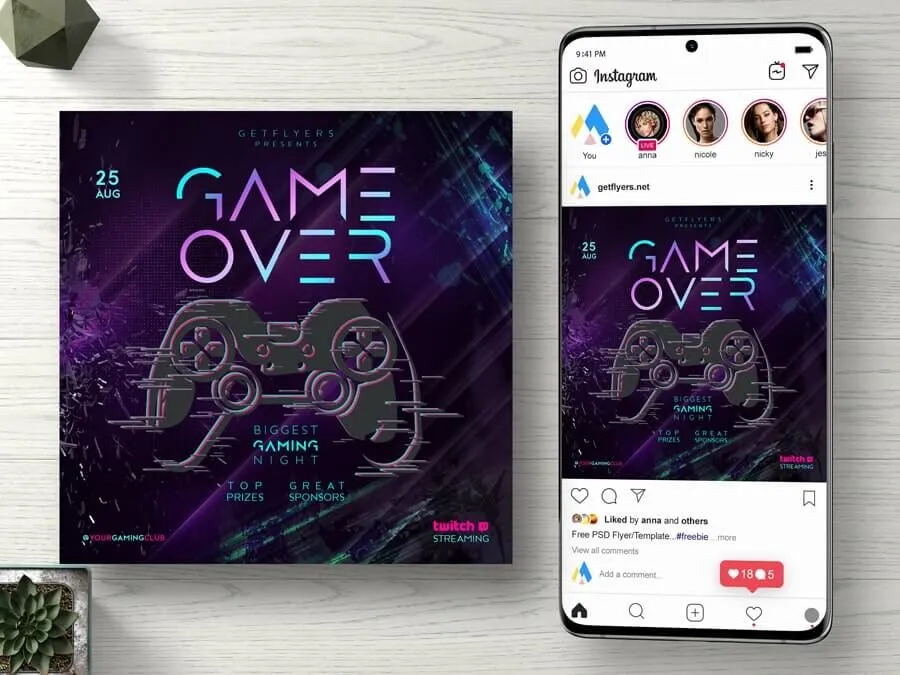 This is an that comes with a wireless controller centerpiece and a title slot in neon colors. It features a dark background in a futuristic style that’s ideal for promoting video game events. The file is in a PSD format and comes in a square layout, which is fit for making banners to upload on Instagram and other social media platforms