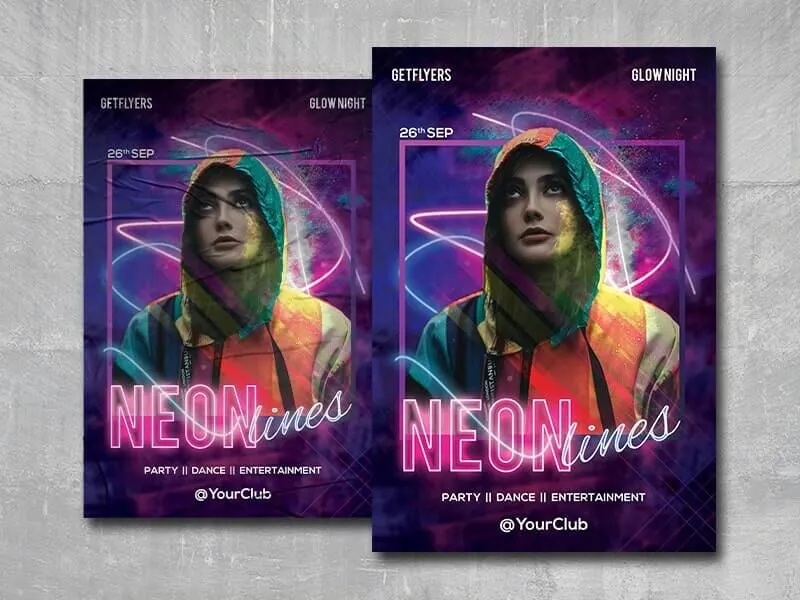 There are neon lines in both the background and the foreground that add to the visuals. You’ll get a photo centerpiece in the foreground that is to be replaced with your own model image. There is a big neon title slot at the bottom left in which you can write your own title. You’ll have a smooth and fast editing process thanks to the organized layers.
