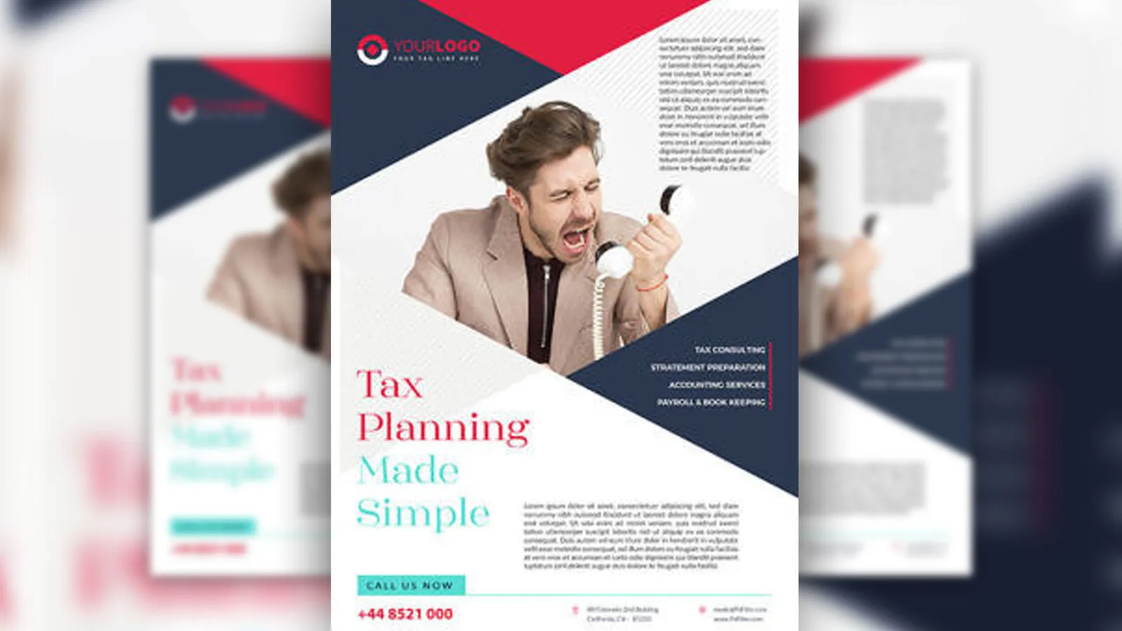 It’s a tax services company, a that comes with a layout in the size of A4. The flyer is in a superb color scheme of white, red, and navy blue that gives off sharp, professional vibes. You have a photo placeholder at the top to add your stock photos to the flyer. It’s a breeze to customize this PSD template. Give it a try!