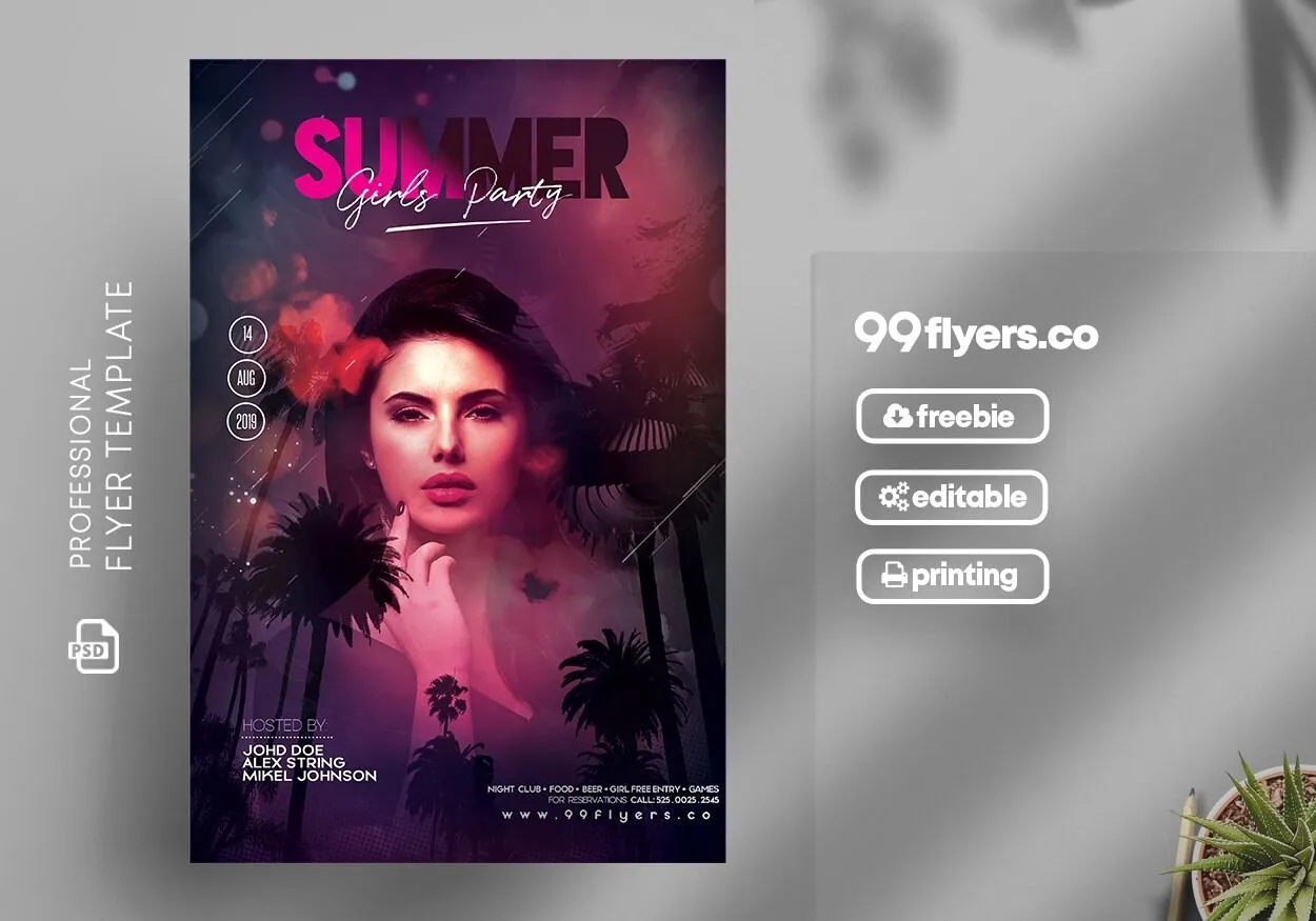 The Girls Party Night Club Flyer Template features a vibrant design with large tropical trees in the background, creating an inviting atmosphere for your nightclub events. This template is perfect for promoting parties and encouraging girls to join in on the fun at your venue, complete with music and drinks.