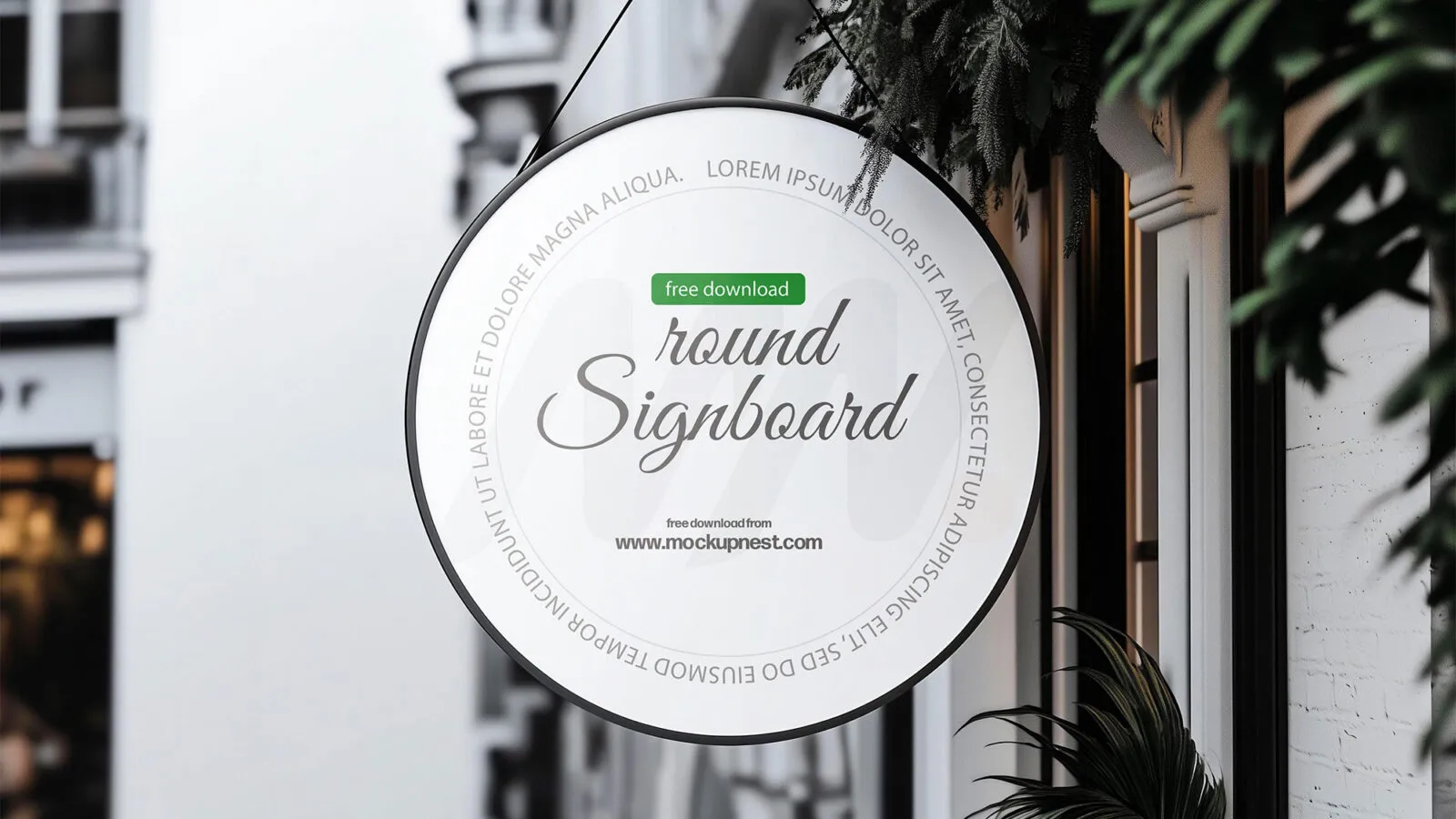 Showcase your business with the classic appeal of the Hanging Round Signboard Mockup. This unique PSD file features a round sign hanging from a durable bracket, making it a great fit for cafes, pubs, or boutique shops. You can easily add your logo and text using smart object layers to achieve a realistic appearance that mimics authentic weathering and soft outdoor lighting.