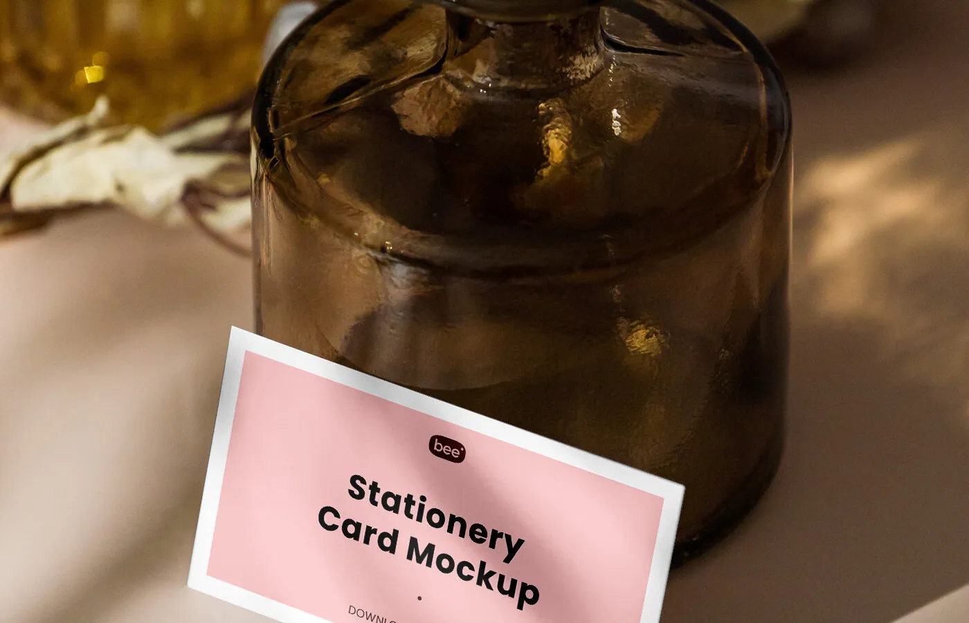 Horizontal Stationery Card Mockup with Vase in Perspective View