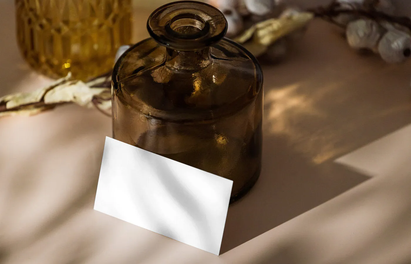 A card can be used for brand introduction, invitation, advertisement, memorial, or for other purposes based on your creativity and this option can provide a minimal and adorable design. This layout illustrates a horizontal card beside a crystal vase placed on a natural scene.