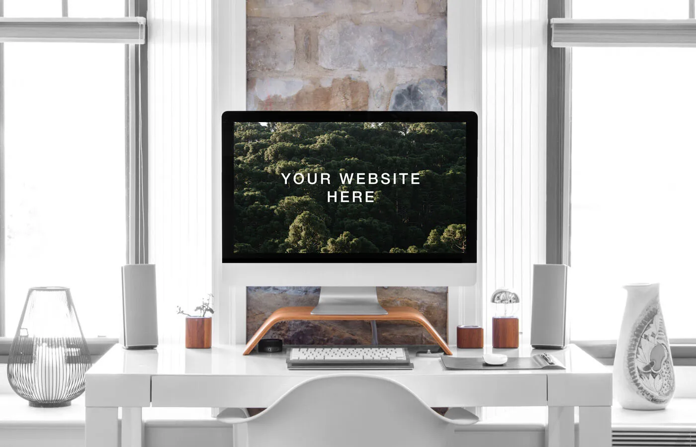 The Hyper Realistic iMac on a Desk in a Room Front View Mockup is ideal for showcasing your website or app projects in a natural setting. This mockup features a 27-inch iMac, offering a highly realistic visual that enhances the presentation of your digital work.