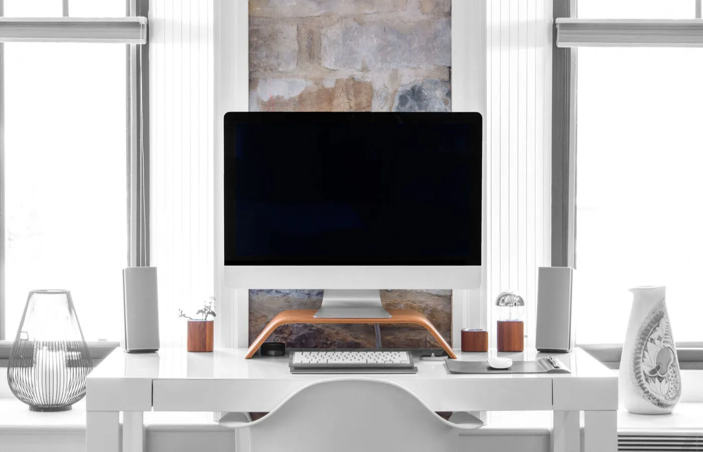 The scene captures a front view of the iMac placed on a white desk, positioned between two large windows in a room. The setting is bright and lifelike, with various decorative items such as a small wooden plant pot, flower vases, glasses, speakers, a keyboard, and a mouse on a mat. This mockup provides a perfect backdrop for making your presentation stand out.