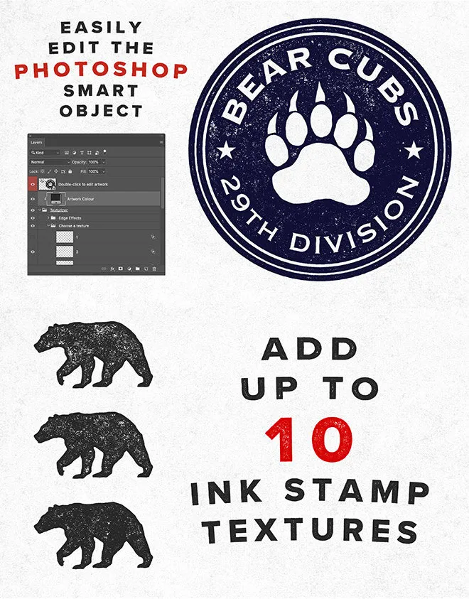 The Ink Stamp Texturizer Smart offers a collection of 10 ink stamp text effects that can give your designs a retro and weathered look. These effects are perfect for enhancing advertising banners, website hero images, logos, and other creative projects with a vintage touch that resonates with audiences who appreciate retro styles.