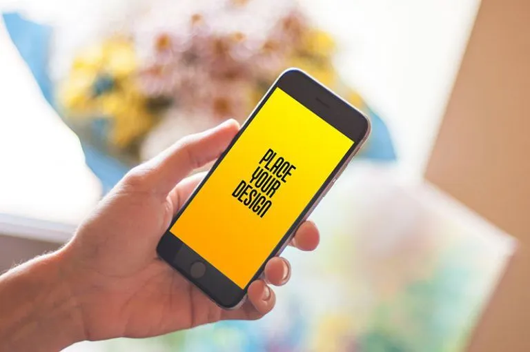 The mockup features a single shot of an iPhone held in a hand, providing a perspective view with a blurred indoor background. To customize the mockup, simply insert your design into the smart layers. This process is straightforward and requires no advanced skills, thanks to the user-friendly smart objects.