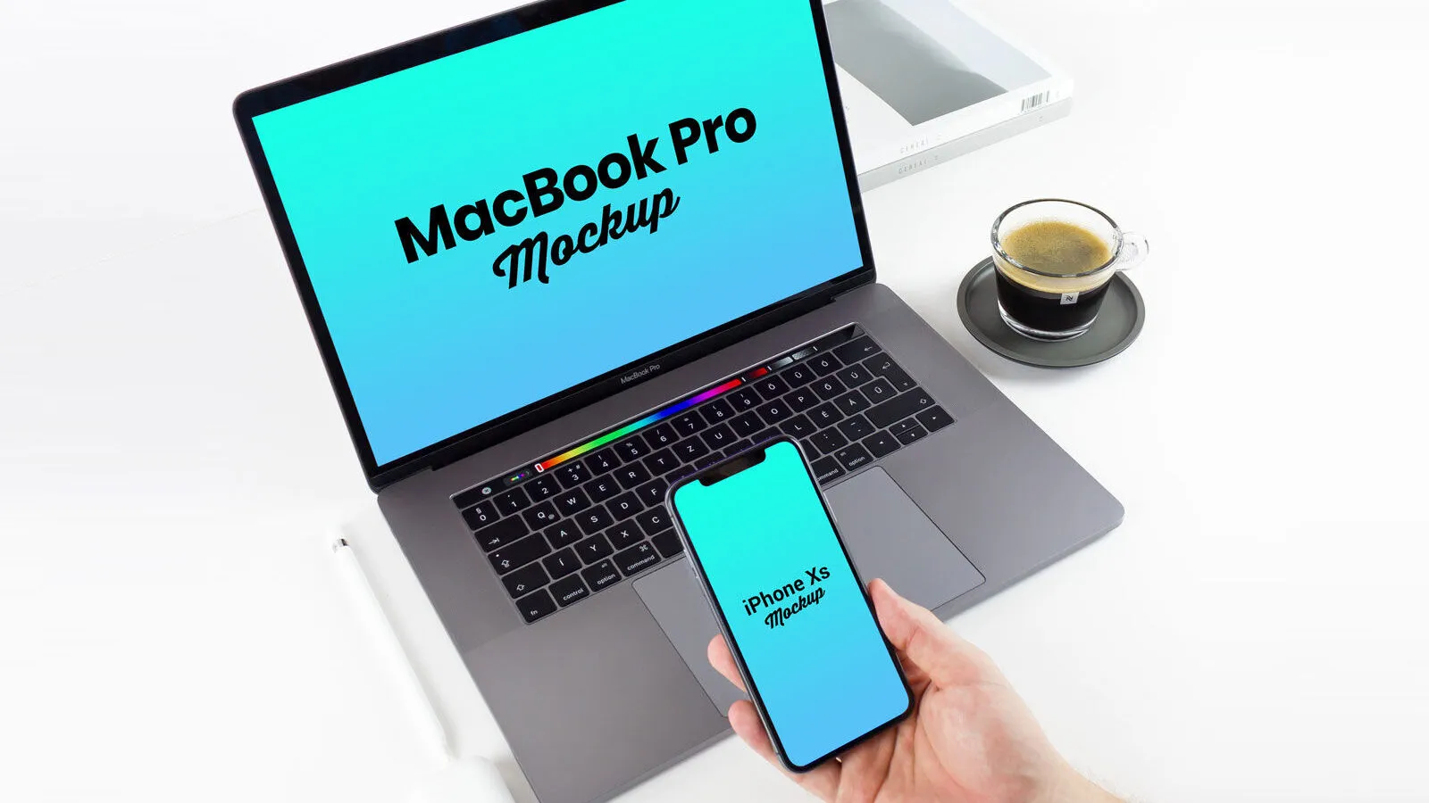 This mockup features a MacBook Pro 2018 and an iPhone Xs, providing a realistic setting to display your designs on multiple devices. The scene includes an iPhone Xs held in hand in front of a MacBook Pro 2018, accompanied by items like a cup of coffee, an AirPods case, and an Apple Pencil. The clean white table surface enhances the visibility of your design.