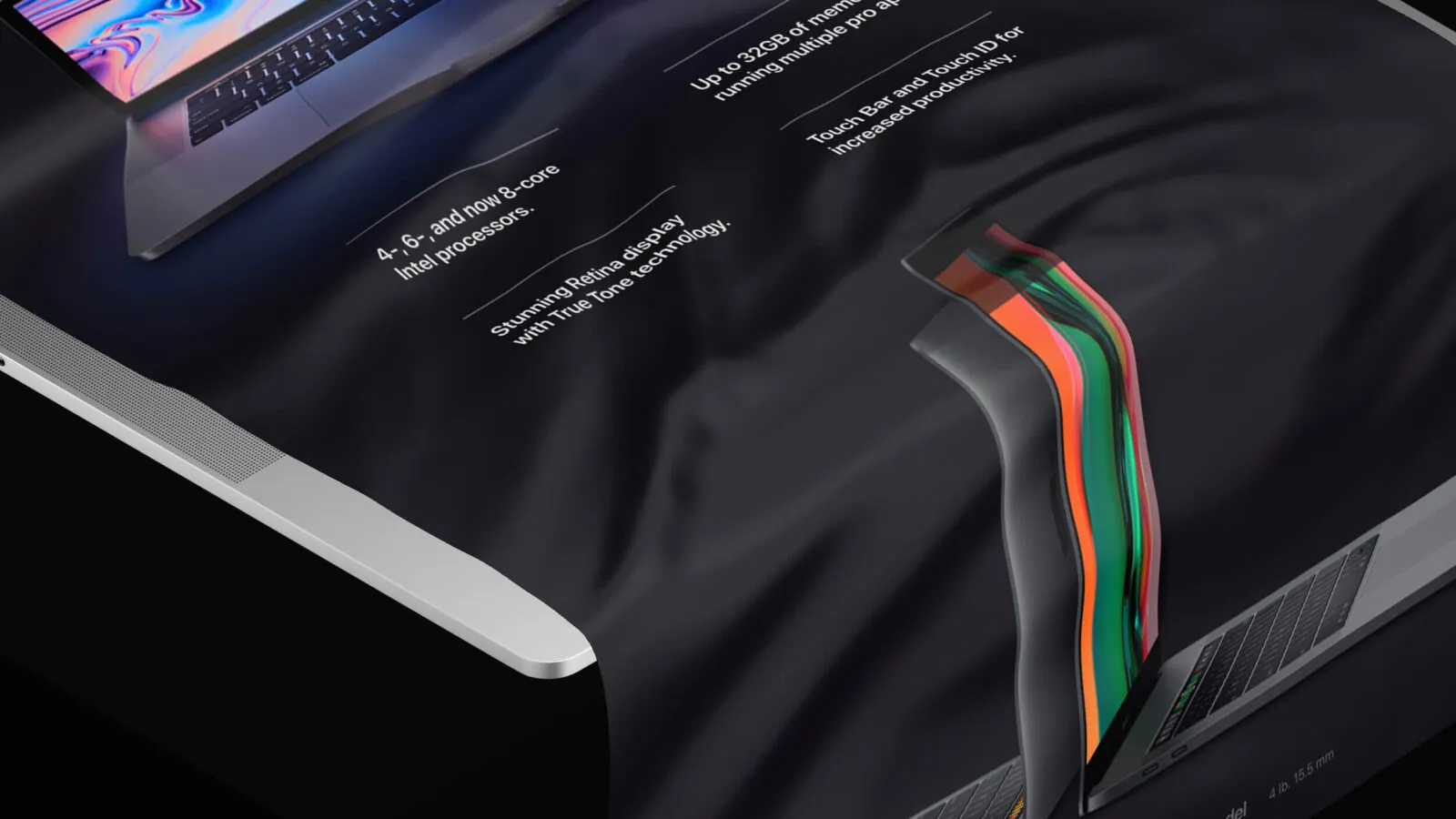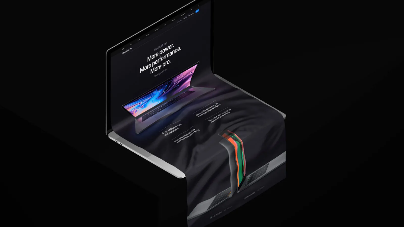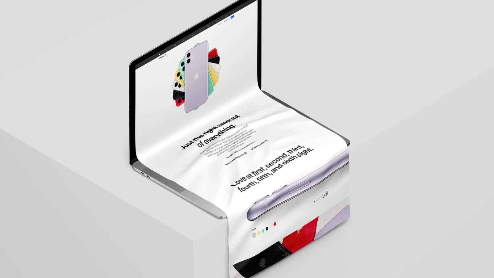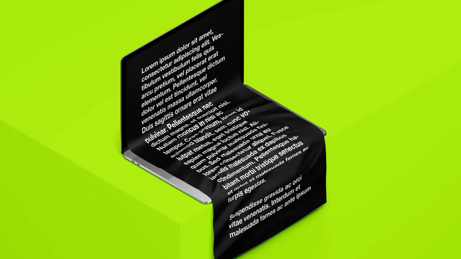 This mockup showcases a MacBook that is mostly covered by a long scroll, which appears to be made of fabric due to the wrinkles at its bottom. The scroll is so lengthy that a portion of it hangs in the air. The MacBook is positioned within a simple, single-colored background that enhances its visibility.