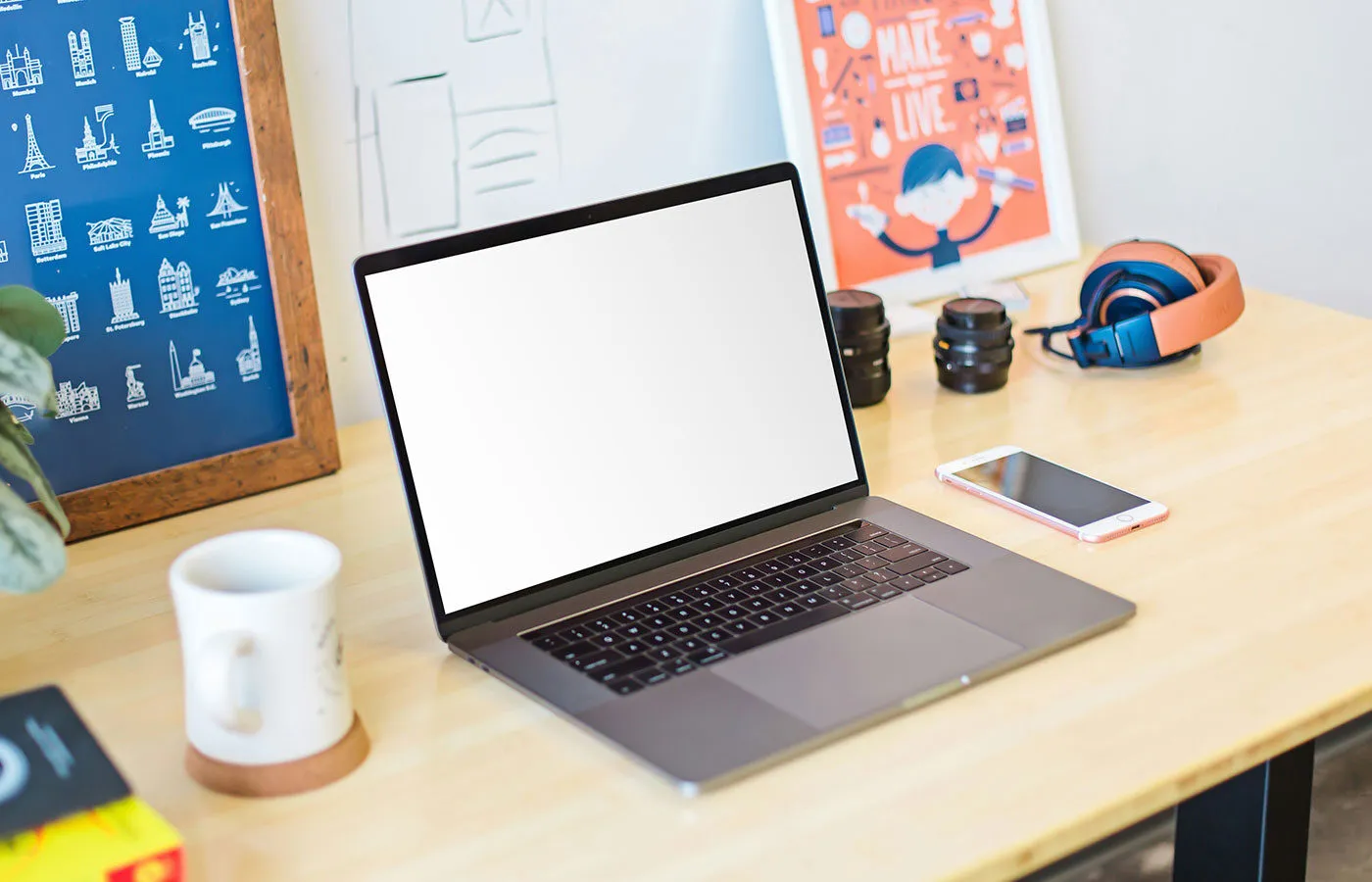 The MacBook on Desk Mockup is an ideal tool for showcasing digital designs in a realistic workspace environment. It features a MacBook positioned on a modern desk with subtle office essentials that enhance its sleek design without drawing attention away. The high-resolution PSD file includes smart layers, making it easy to customize by inserting screenshots, adjusting lighting, or tweaking angles while keeping reflections and shadows authentic.
