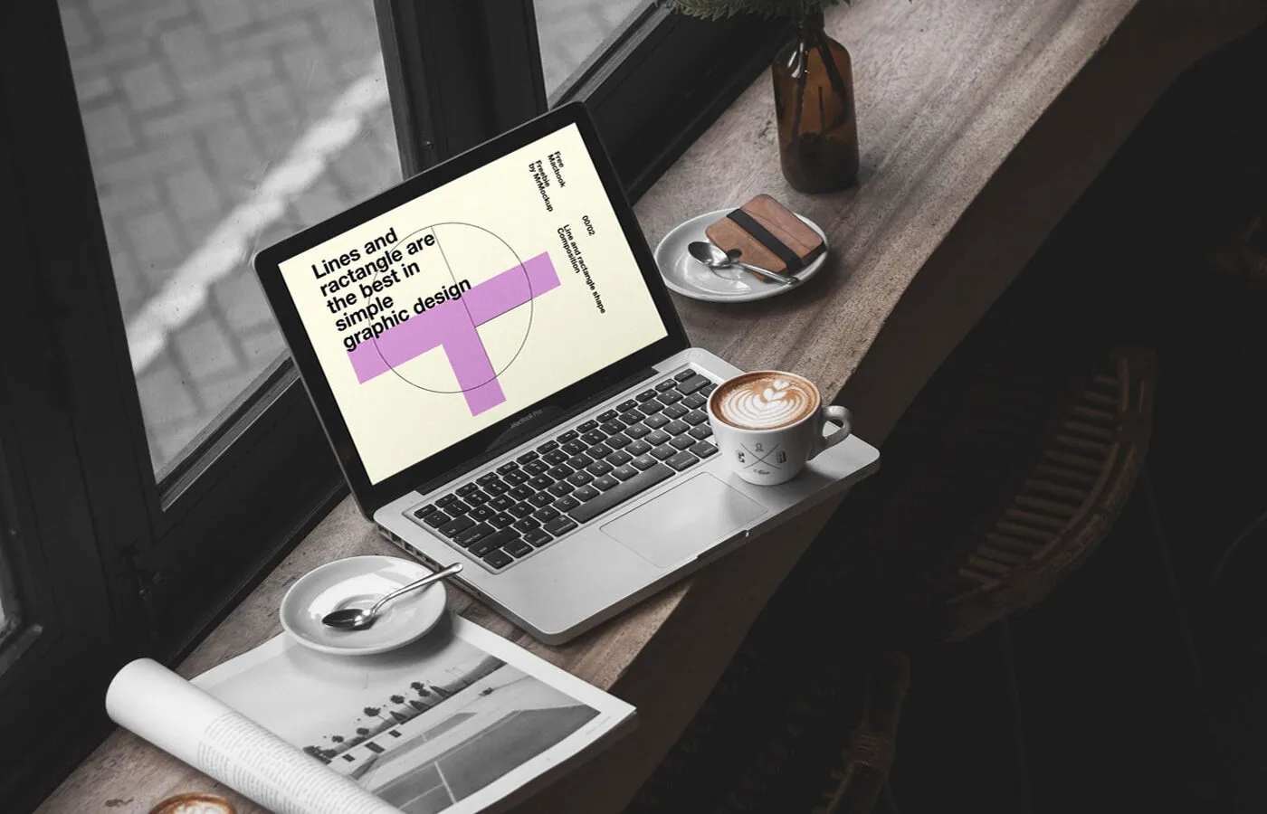 The MacBook Pro in Cafe Environment Mockup is perfect for designers looking to present their website projects or app branding in a realistic setting. This mockup features a side view of an open MacBook Pro placed on a cafe workspace by a window, offering a glimpse of the outside. The scene includes an open magazine, a cup of coffee on the laptop, a glass jar with plants, and two saucers, creating a contemporary and inviting atmosphere.