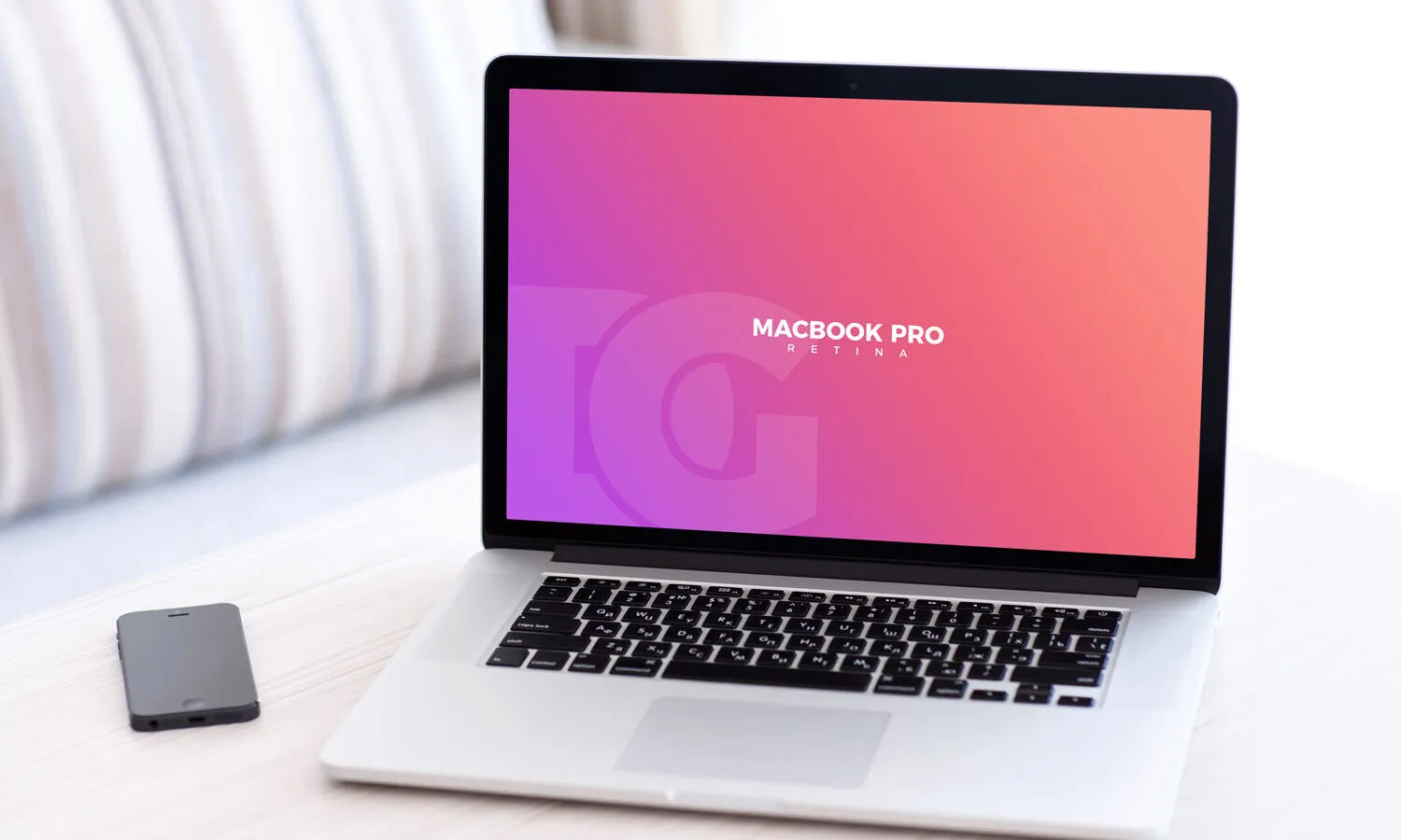The scene depicts a realistic room setting with the MacBook Pro open on a desk and an iPhone placed nearby. Simply insert your project into the smart layers to present it effectively to your audience. This mockup is part of a larger collection, so feel free to explore more options if needed.
