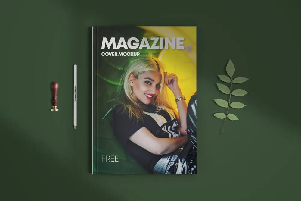 There is a in this download that provides you with a closed magazine placed on a green background. You will get a top-view shot of it laid in between decorative objects on each side, such as a plant stem, a pen, and a stamp. All it takes for your own design to appear on the cover of the magazine is a few clicks.