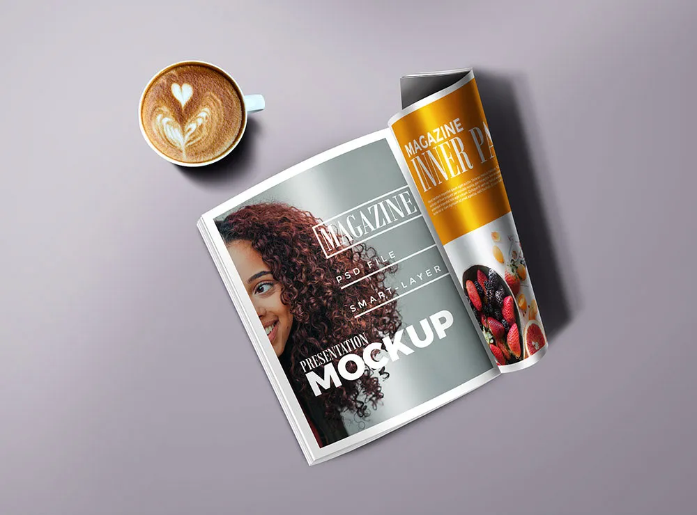 This mockup views to fastidious designers a folded magazine inner page, which showcases a beautiful girl which your design can replace it laying on a strong neat wooden surface. In addition to a cup of elegantly designed coffee beside it. Which creates a calming eye-catching perspective which could help you select a matching design. Just insert your artwork and change the background if you need and enjoy it.
