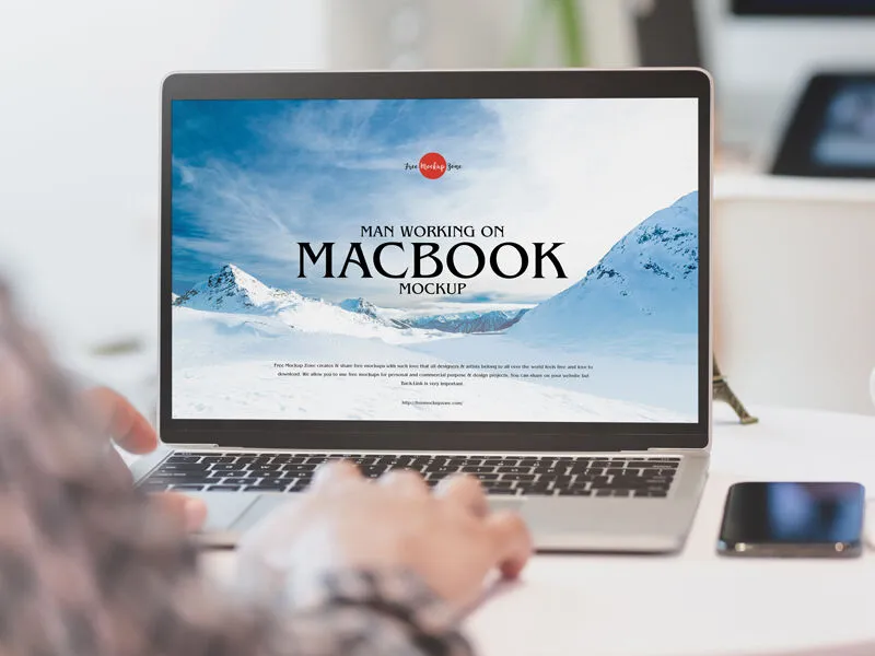 This mockup features a silver MacBook open on a white desk, highlighting its sleek design with a black screen frame and silver keyboard. A phone placed next to the MacBook adds a unique touch to the scene. The presence of a man poised to type on the MacBook enhances the realistic feel of the image.