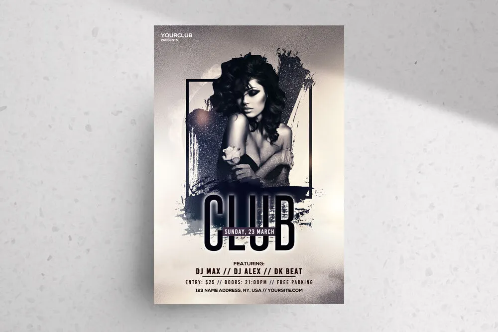 It’s obviously perfect for any of your birthday parties, DJ events, music concerts, ladies’ night, and any other event in general. Brilliant, isn’t it? You’re just going to need a model image, and this creative frame with its paint stains and the striking title font takes care of the rest. So what are you waiting for?