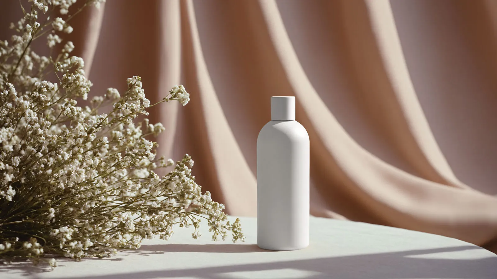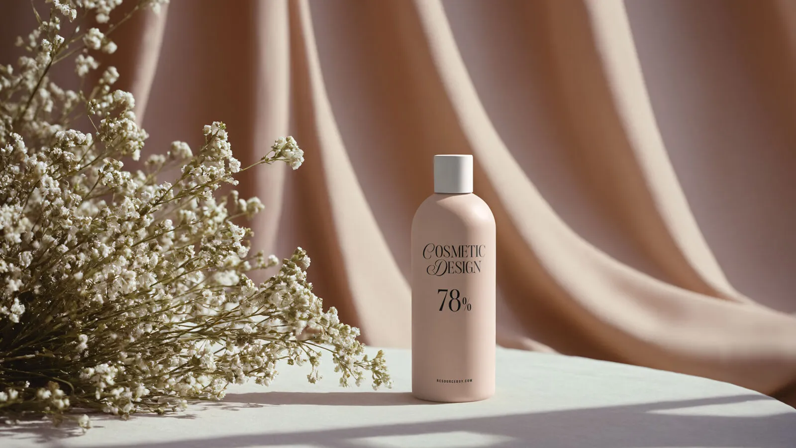 Set against a soft beige draped background with natural lighting and subtle floral accents, the mockup creates a serene and luxurious atmosphere. It is ideal for showcasing products like lotions, toners, or serums, appealing to customers who value elegance and simplicity in their beauty choices.