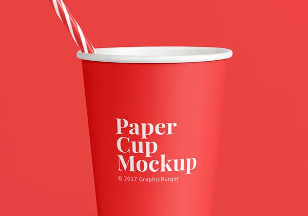 This mockup features two classic paper cups set against a monochrome background. One cup includes a red and white striped straw. The cups have contrasting designs; one is red with white text, while the other has the opposite color scheme. You can easily place your own design in the center of these cups to communicate your message effectively.
