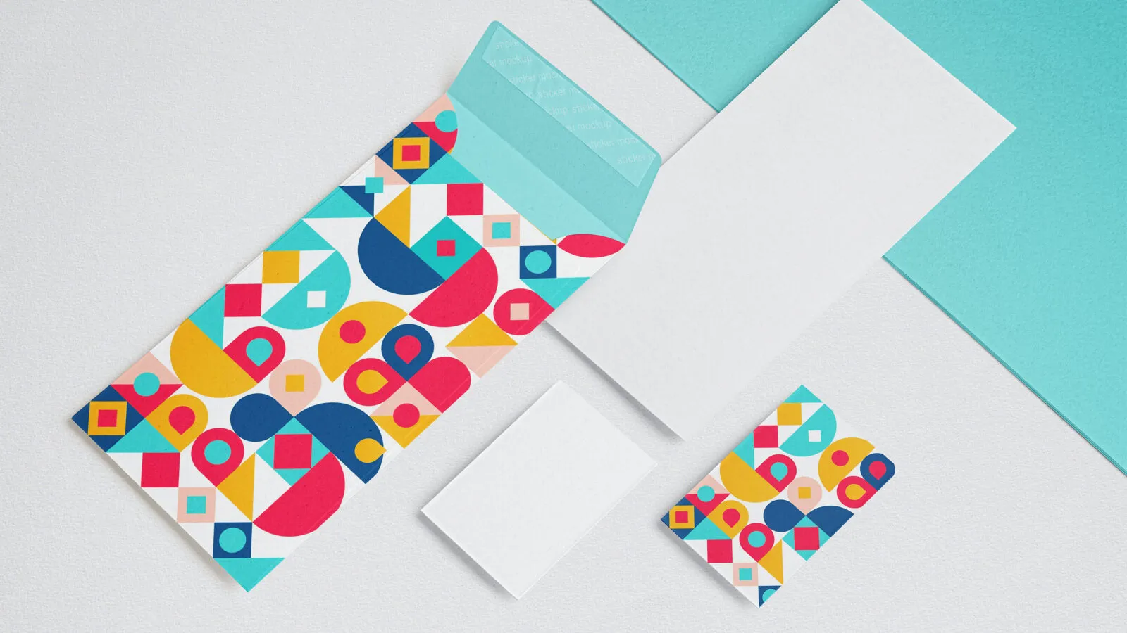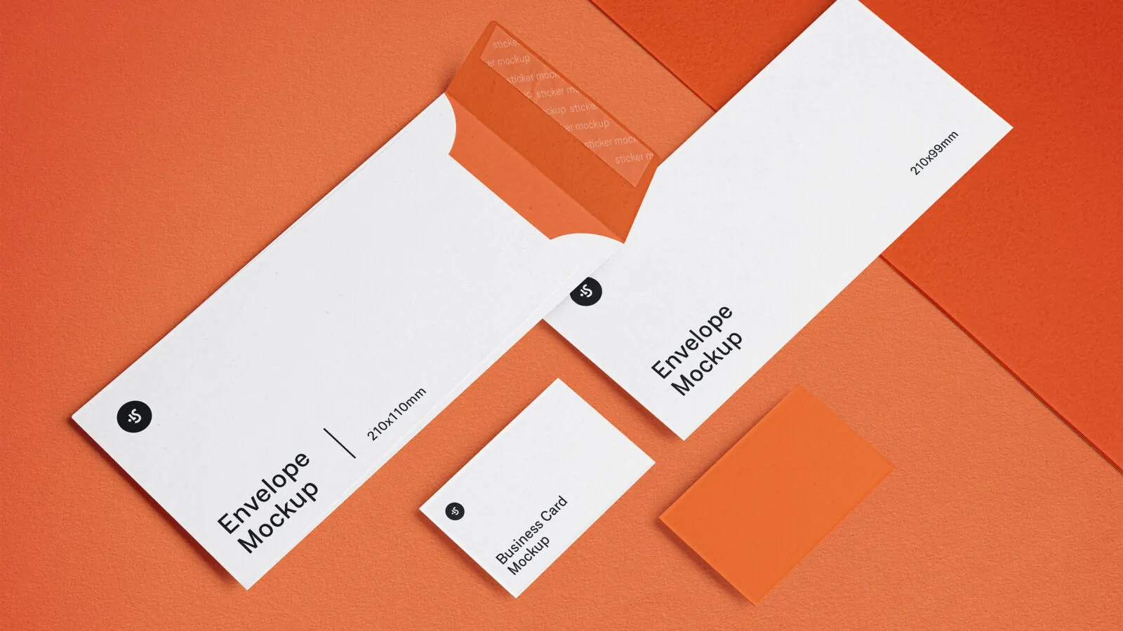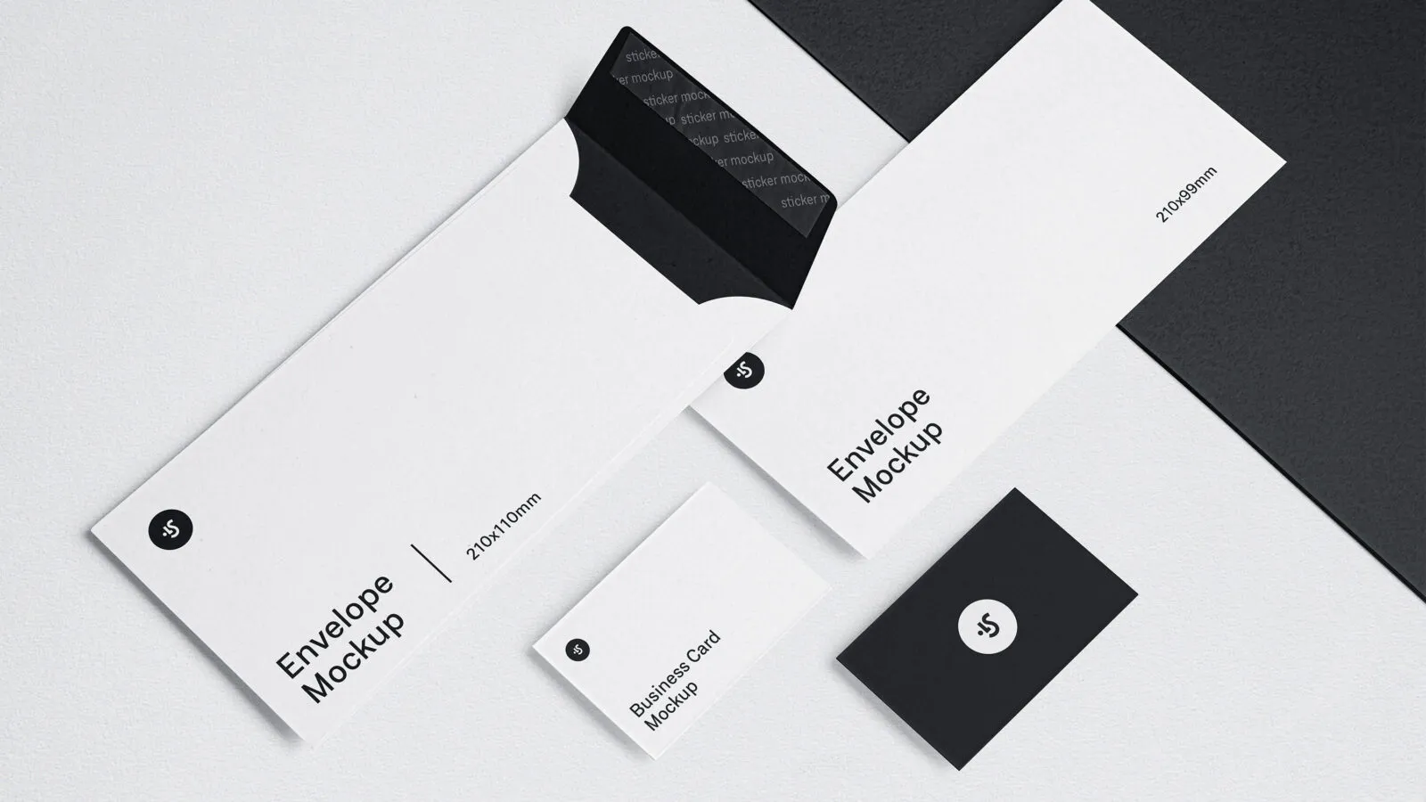 Two business cards and two envelopes are presented in this mockup. One of the envelopes showcases the front view, and the other one displays the back scene. All of these items are located on a surface divided into two parts. You can edit each part’s colors individually. All of the visible elements in this are separated with distinct shadows.
