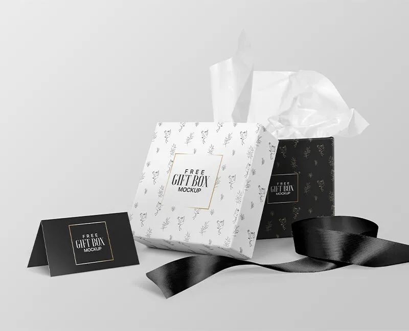 Mockup Featuring 2 Square Gift Boxes, Greeting Card, and Ribbon