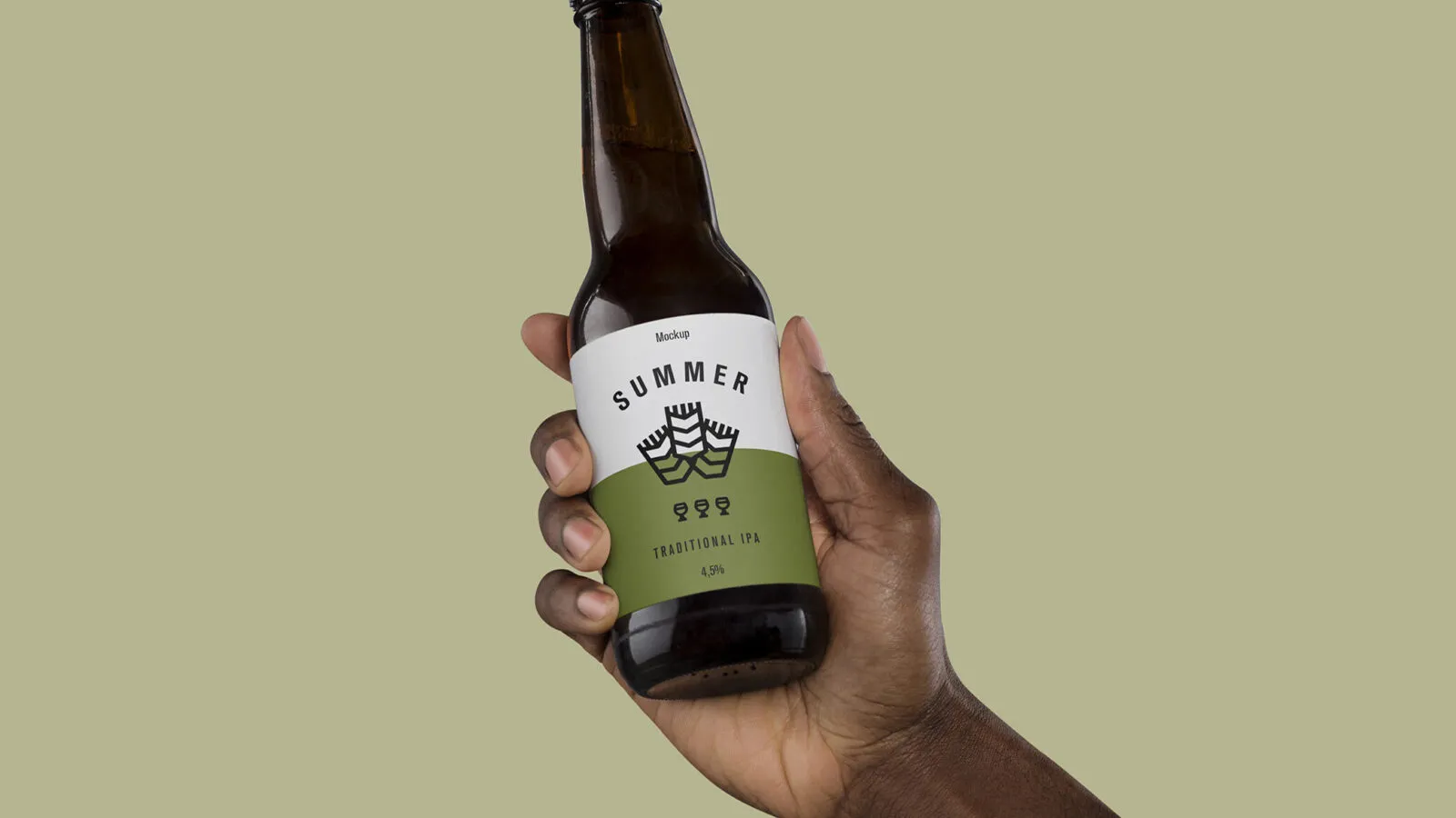 This mockup features a beer bottle held in hand, providing a clear front view that is ideal for showcasing your branding. It is designed to be easily customizable, allowing you to change the label color and add text with ease.