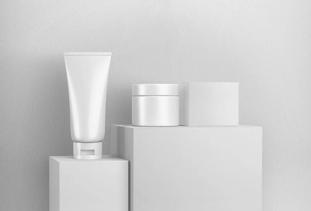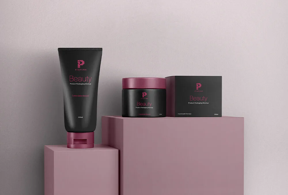 Have a few cosmetic packaging designs to showcase but don’t know how? Then I bet you’re going to be pleased with today’s amazing mockup. It includes a cosmetic tube on one cube display stand and a round jar next to its paper box standing on another. By downloading the PSD file, you can showcase three different beauty branding designs and see how they look together as a group.