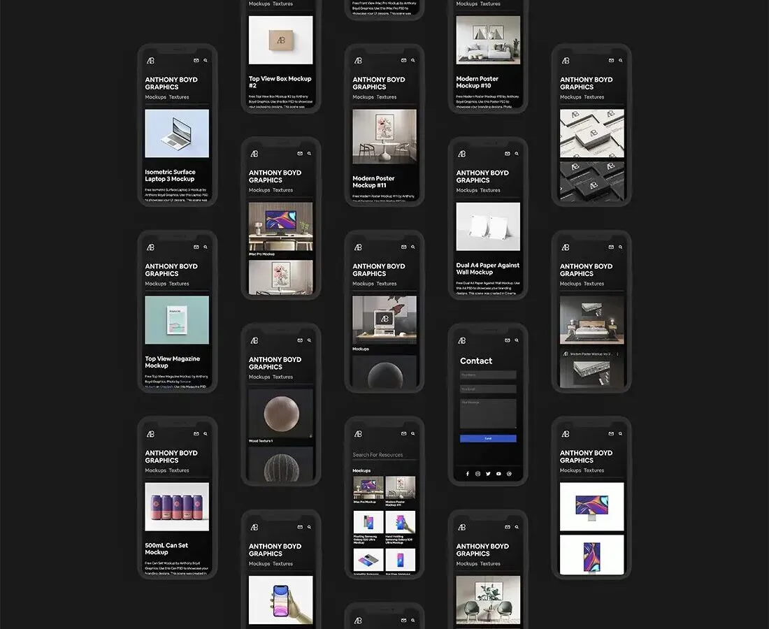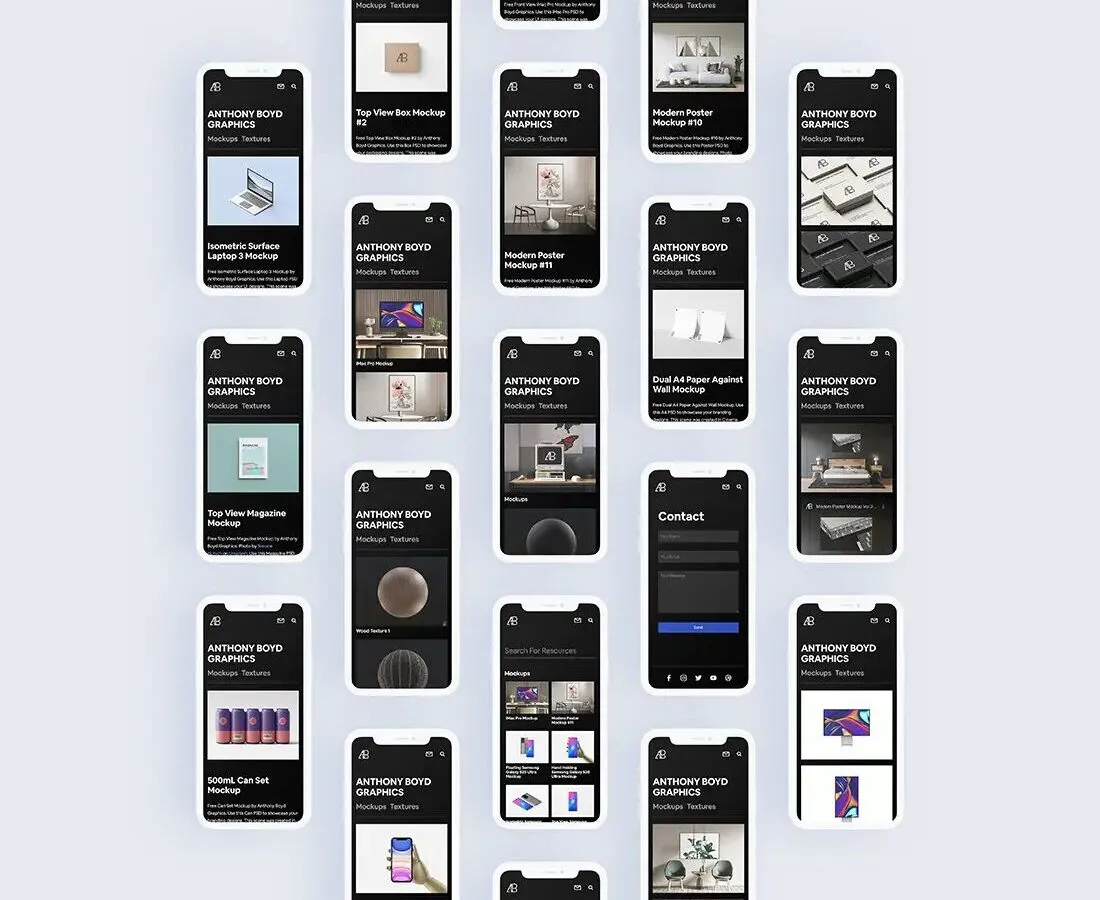 This mockup showcases a grid of iPhone 11 Pro Max devices arranged in a diamond-shaped pattern. Designed by Anthony Boyd Graphics, this flat view allows designers to display their work in a distinctive way.
