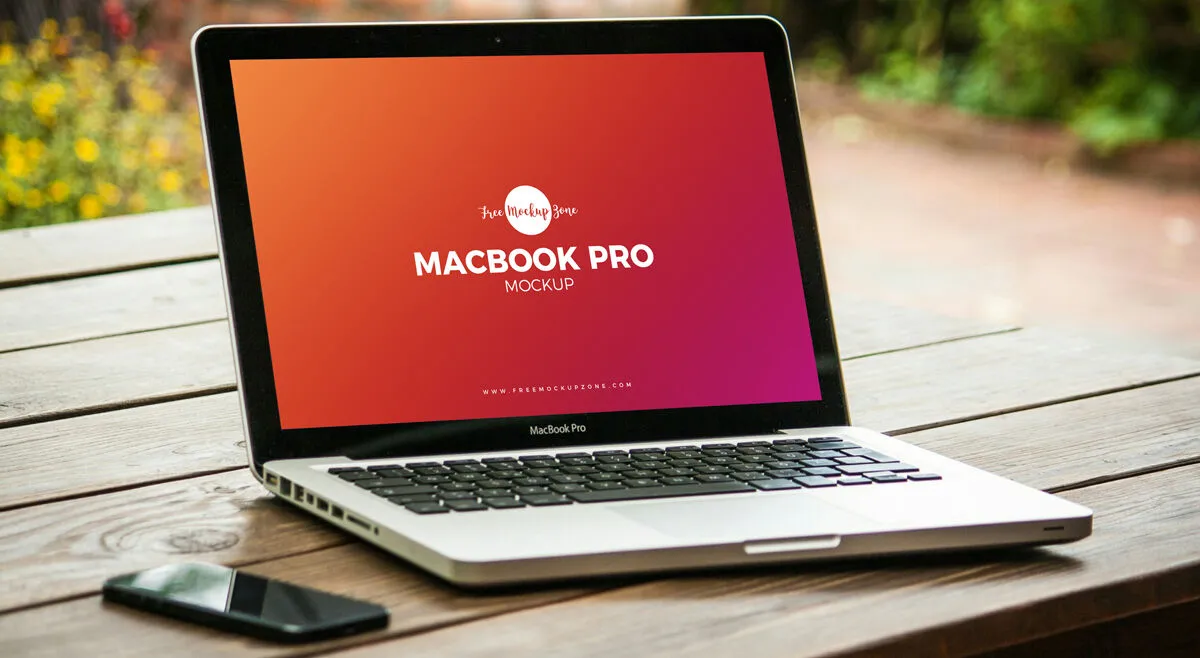 The file is available in PSD format and includes a detailed image of an open MacBook Pro placed on a wooden table with a smartphone beside it. The background features a soft blur with an outdoor view and some plants, adding depth to the scene. Simply insert your project onto the screen to see how it enhances your presentation.