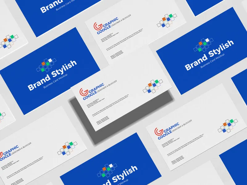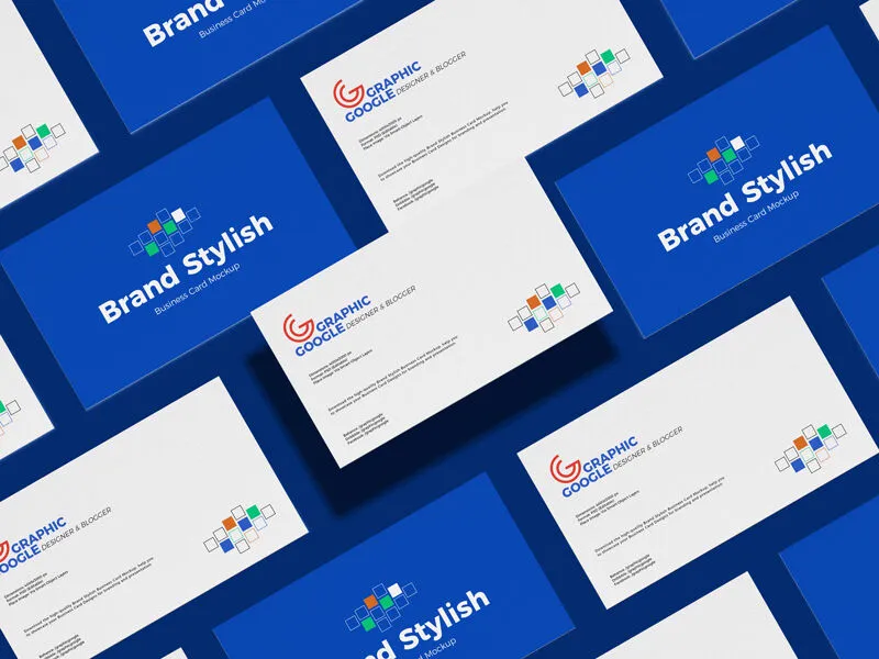 The mockup includes a sample image showing the cards in a diagonal grid, with one card hovering slightly above the rest to highlight its details. This setup helps you see how your design stands out in a real-world setting, offering a practical way to assess the impact of your business card.
