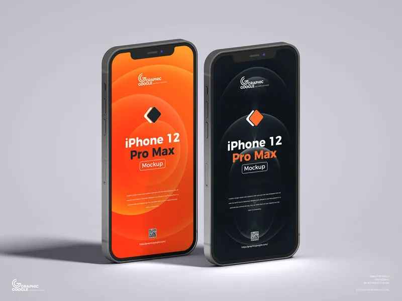 This mockup features two iPhone 12 Pro Max devices standing side by side in a half-side view. The clean and simple scene highlights the sleek design of the phones, with the shadow of the front phone slightly overlapping the one behind it. This setup provides a clear view of the devices, making it ideal for showcasing website designs, UI apps, or other digital projects.
