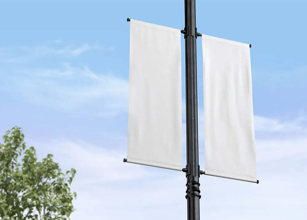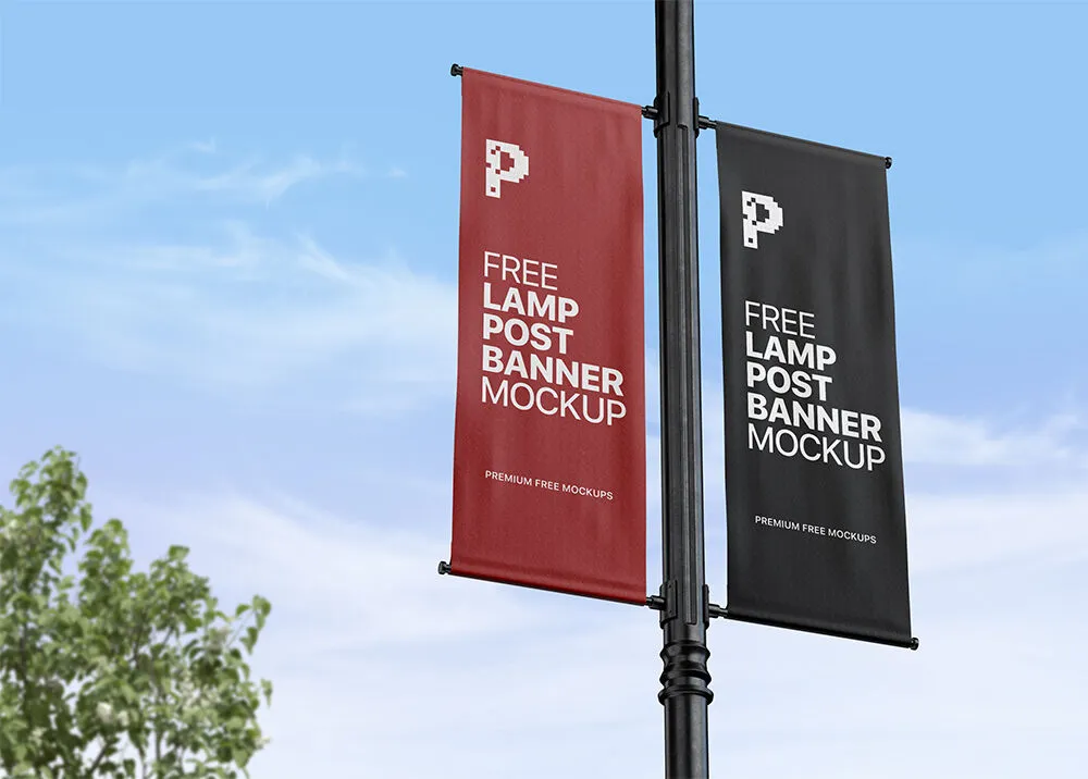For those designing advertisements, presenting your work on a lamp post banner can be an effective way to visualize your ideas. This mockup features two banners set against a scenic backdrop of the sky and trees, providing a realistic context for your designs.