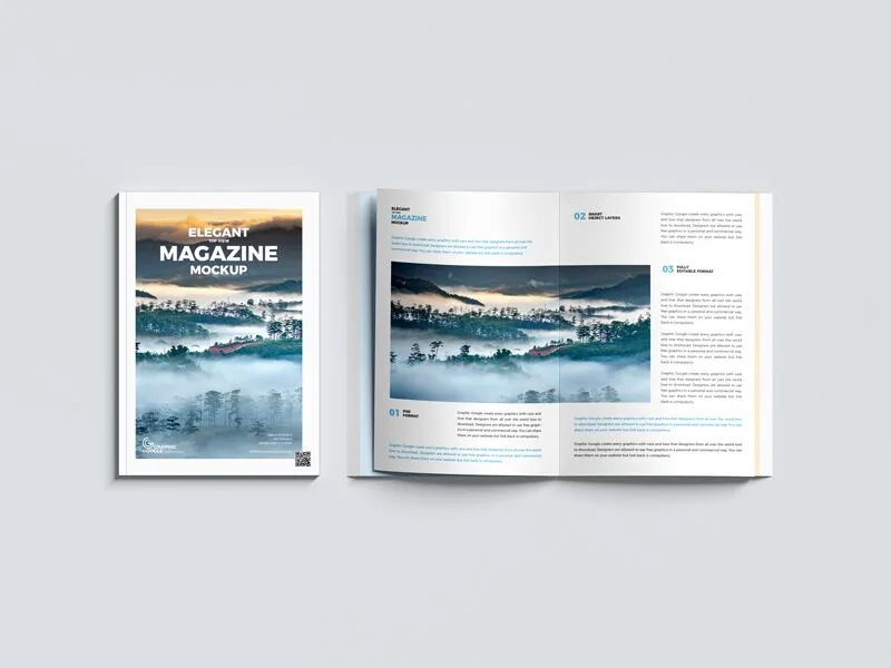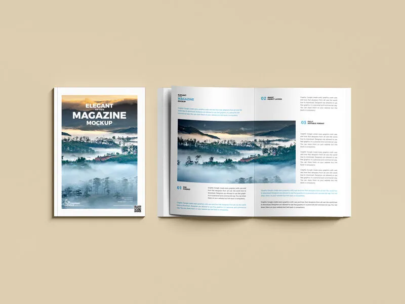 The PSD file offers a top-view photo of the magazines placed side by side. Use the closed magazine to highlight your cover design and the open one to present additional content or artworks. The background is customizable, giving you the flexibility to tailor the scene to your specific needs.