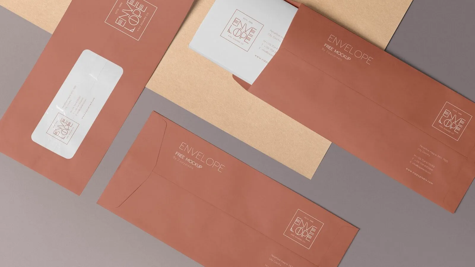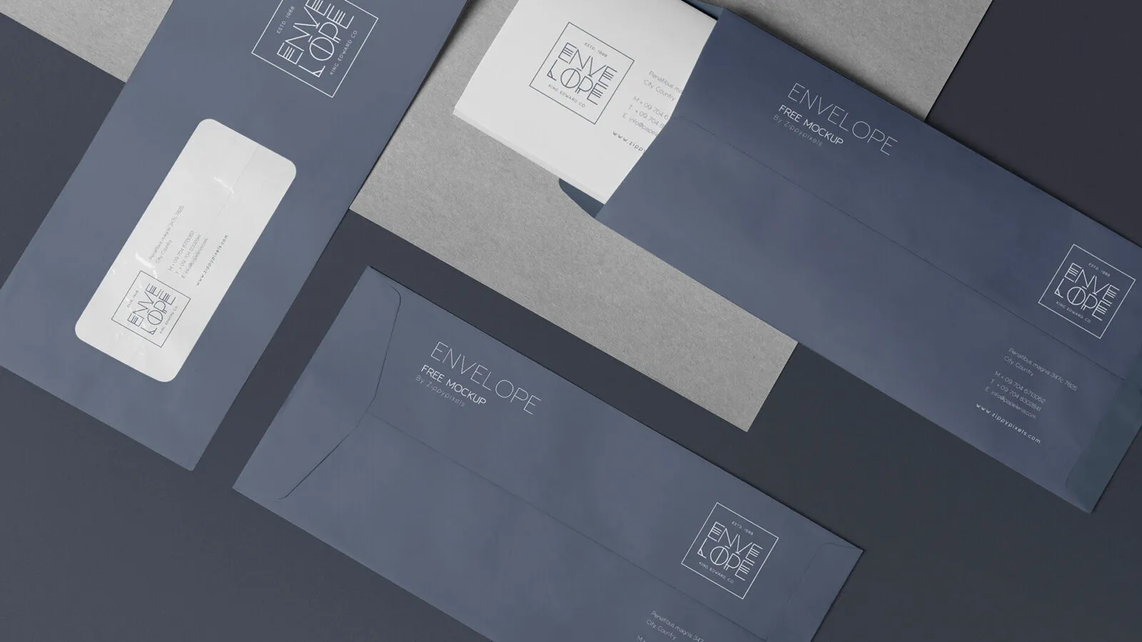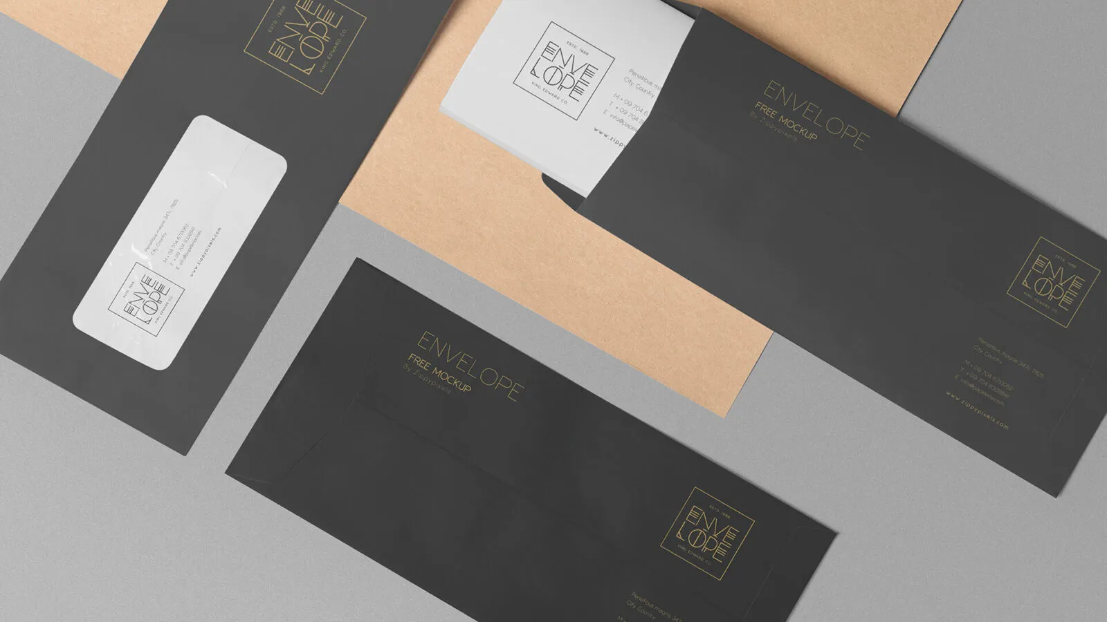 Using mockups can be a helpful way to visualize your envelope designs early in the project. This set features three envelopes displayed at different angles, allowing you to see front, back, and semi-open views.