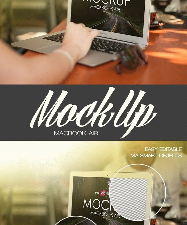 This mockup of a MacBook Air placed in front of a woman is versatile for showcasing various design projects. Whether you want to display wallpaper designs, user interface layouts, or advertisements, this high-quality mockup helps present your work professionally.