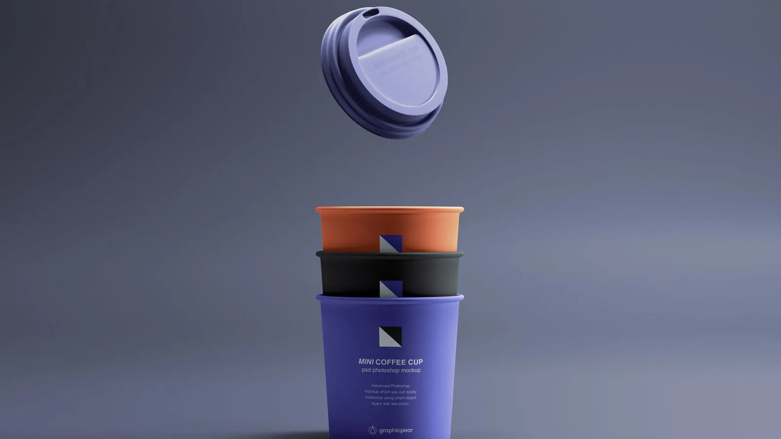 The Mockup of a Minimalistic Coffee Cups with a Floating Cap is designed to help you easily present your coffee cup designs. This mockup includes three paper coffee cups in an upright position, with the cap floating above them to create a realistic and eye-catching scene.