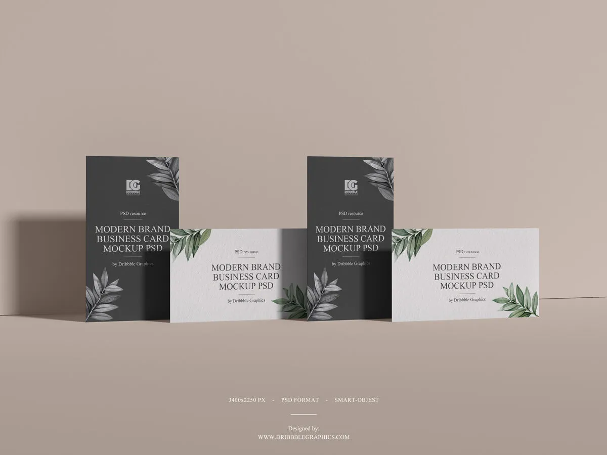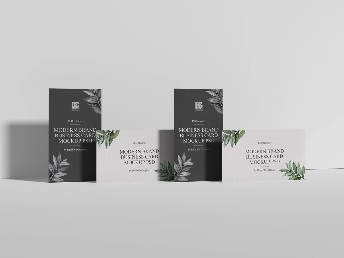 There is one shot of four business cards placed on the surface in an alternating pattern of horizontal and vertical position. This shot gives you the half-side view of them standing before a wall. Interestingly, you can customize not just the business cards but also the background to your taste.