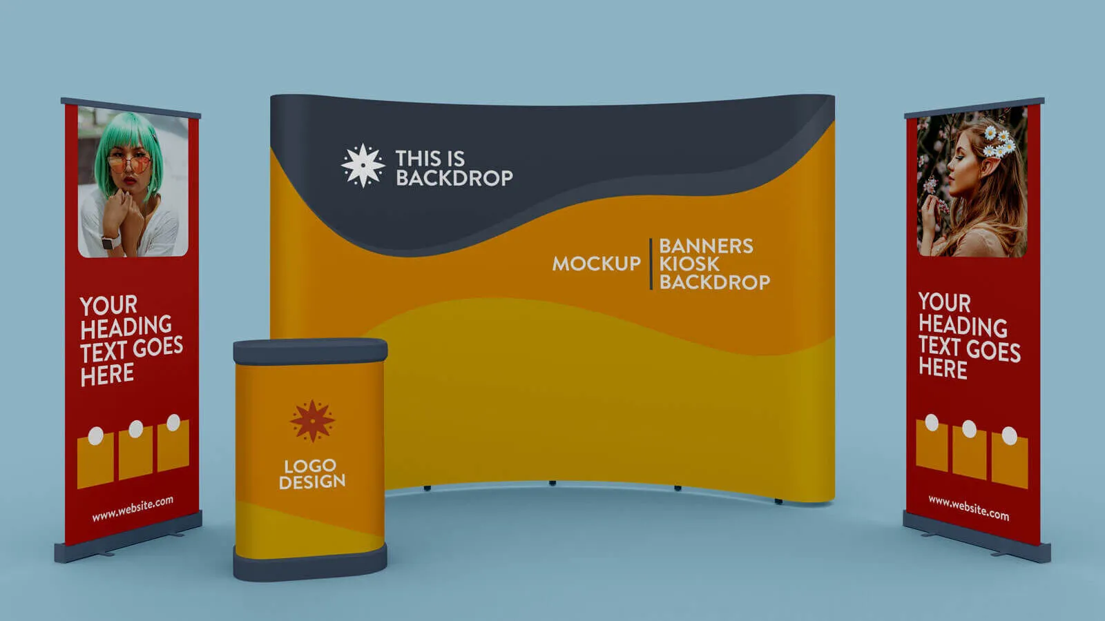 Mockup of Two Standing Banners a Kiosk and a Backdrop