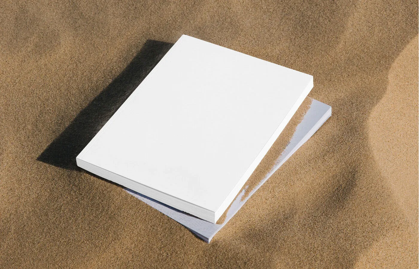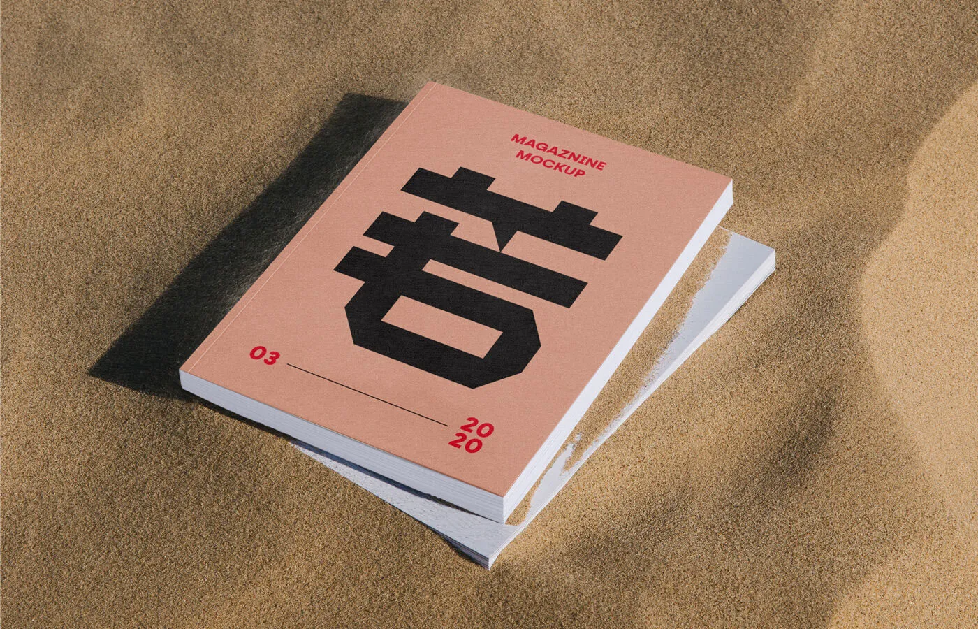 This mockup features two thick rectangular magazines positioned on top of each other, set against a sandy background. The perspective view highlights the magazines’ design, making it an ideal choice for showcasing various artworks and designs. The sand adds a touch of naturalism, providing a unique and lifelike setting for your creative projects.
