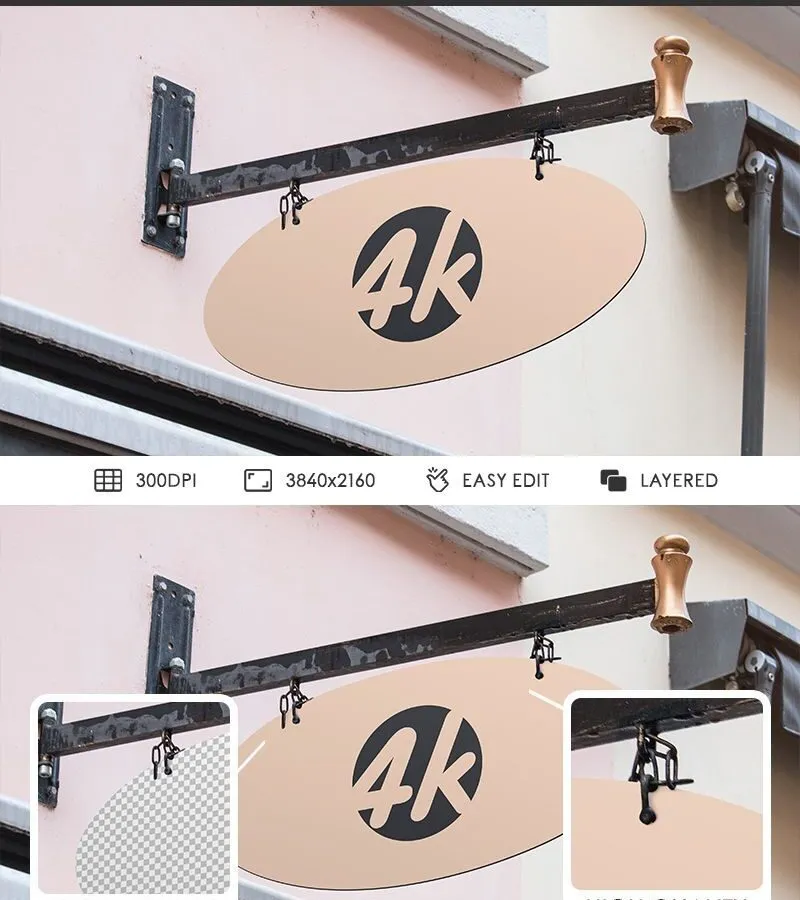 Signboards play a significant role in advertising and promoting business awareness. They can also grab the maximum attention to your profession. Here is a mockup showcasing an elliptical signboard attached to a black metal frame. This common sight can work well for establishments such as cafes and bars, restaurants, or anywhere you want.