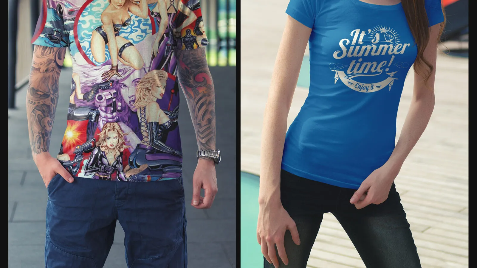 Mockup Showcasing Man and Woman Models Wearing T-Shirts on Street Environment