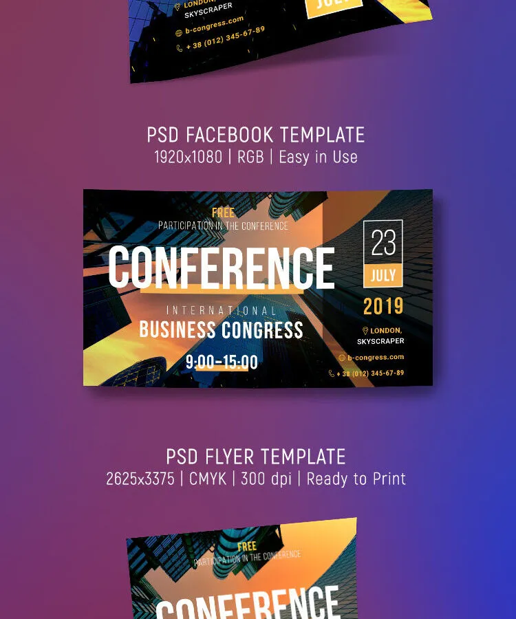 Make your business conference noticed by a larger audience through these modern and easy-to-edit templates. The download file includes a matching pair of , one for a flyer and the other for Facebook covers. The creative background that is actually a low-angle shot of buildings proves to be an ideal choice for business conference promotions, especially one that is supposed to be about architecture-related topics.