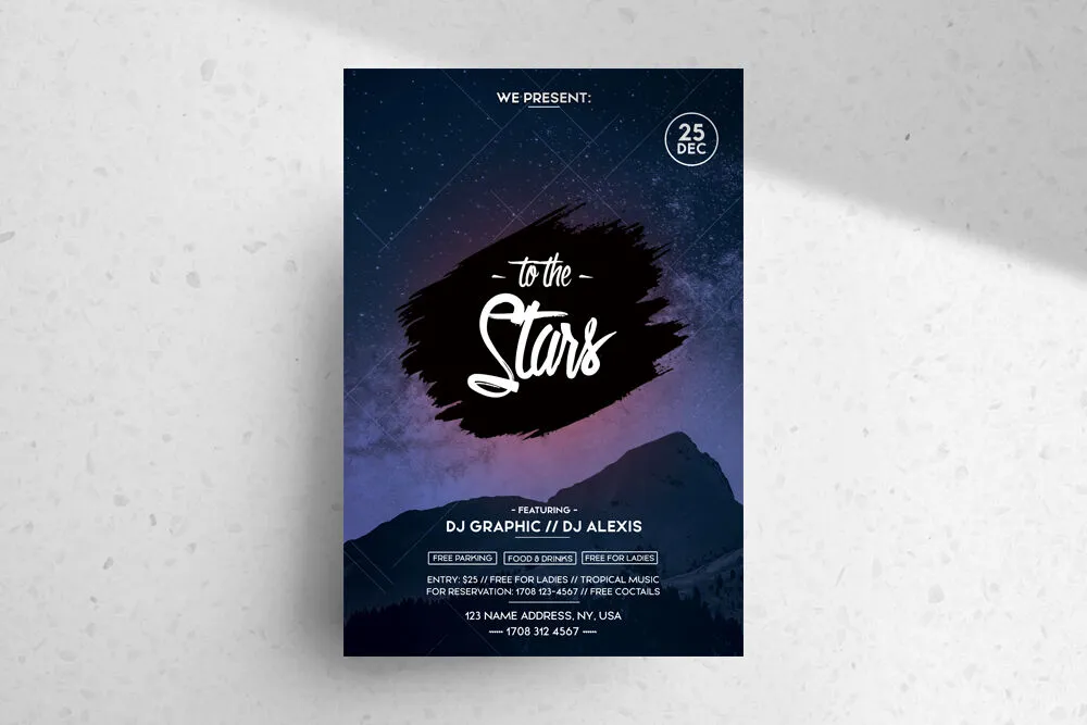 Today’s suggestion is an excellent flyer template for promoting DJ, nightclubs, music, night parties, birthday parties, and other events. This flyer represents a layout of a glittering night sky with stars that can capture party people’s attention. You can use this handsome flyer to display your events remarkably.