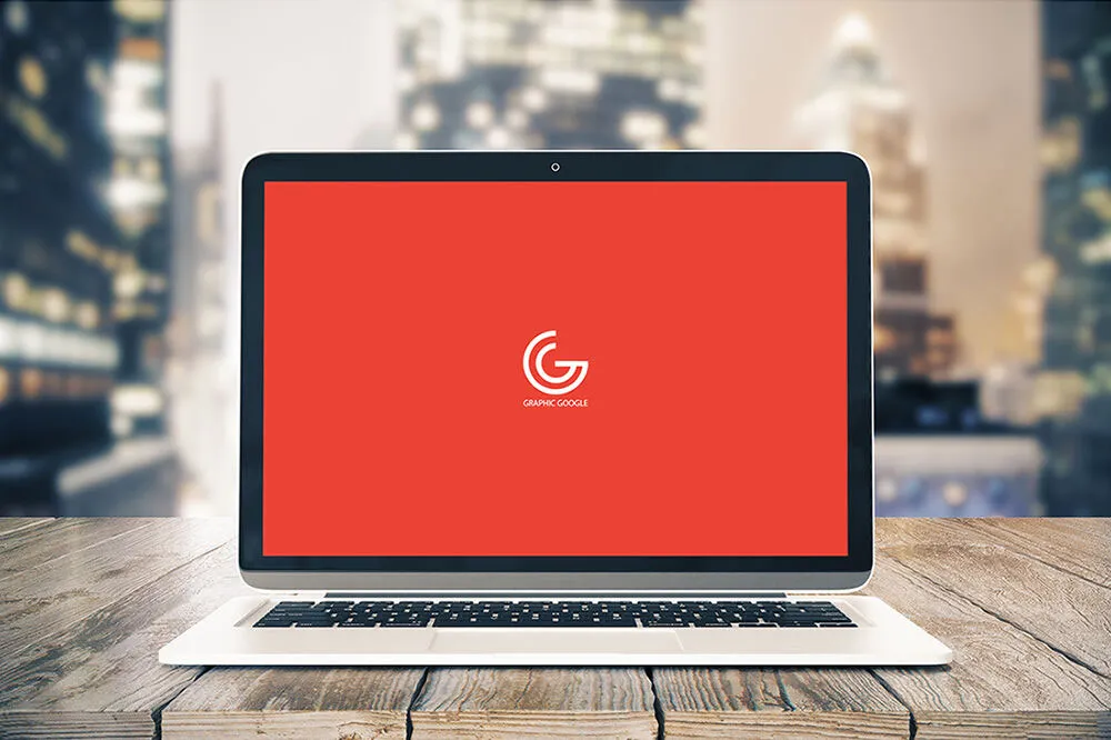 This mockup features an open notebook laptop placed on a wooden table outdoors, offering a stunning view of the city skyline in the background. The scene captures the laptop from the front, providing a realistic setting that highlights your website or project in a natural environment.