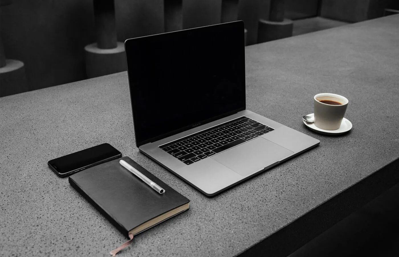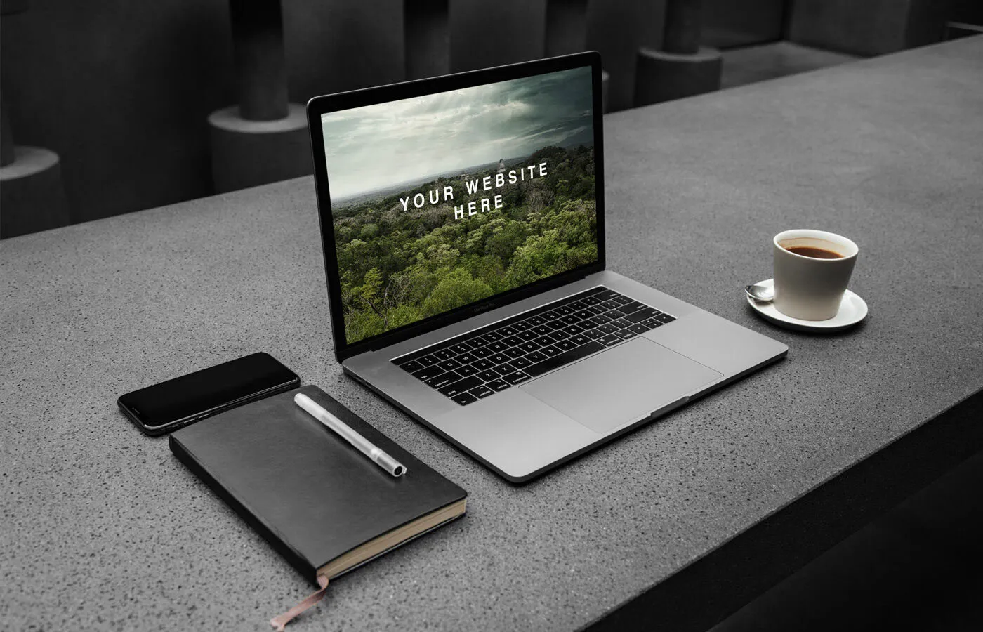 This mockup features an open MacBook placed on a sleek dark worktop, accompanied by a leather notebook with a pen, a cup of coffee on a saucer, and a cellphone. The arrangement offers a visually appealing and modern setting that can enhance the presentation of various projects.