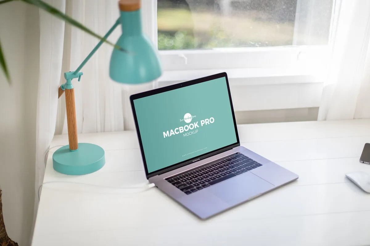 Looking for a realistic MacBook Pro mockup? Well, here is the best you can find online. The black and silver MacBook is opened on a white home office desk. There is a blue lamp and window in the background,  green leaves, and a phone that also makes it more interesting!