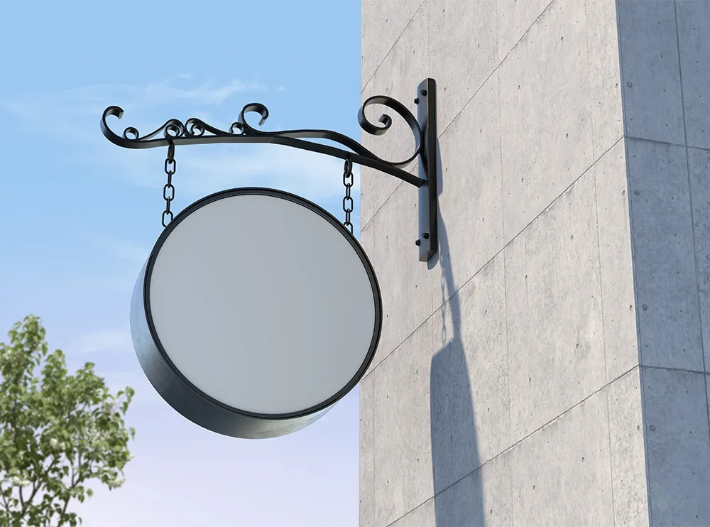 This mockup represents a strong mini circle framed hanging metal shop signage. Suitable for showcasing your amazing shop advertising which is viewable from all surroundings. This shop has a very interesting rare background which is a neat blue sky view, and the concrete wall the sign is attached to creates an amazing perspective that can draw every attention to itself.